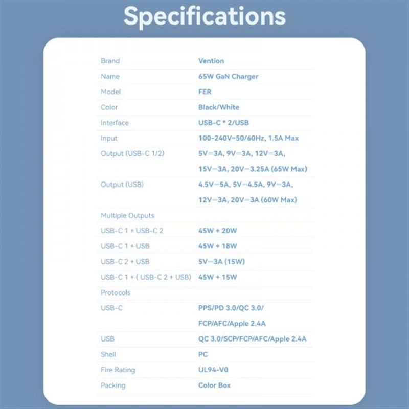 Представляємо зарядний пристрій Vention 65W GaN, компактне та ефективне рішення для заряджання, розроблене для задоволення всіх потреб вашого пристрою в живленні.
