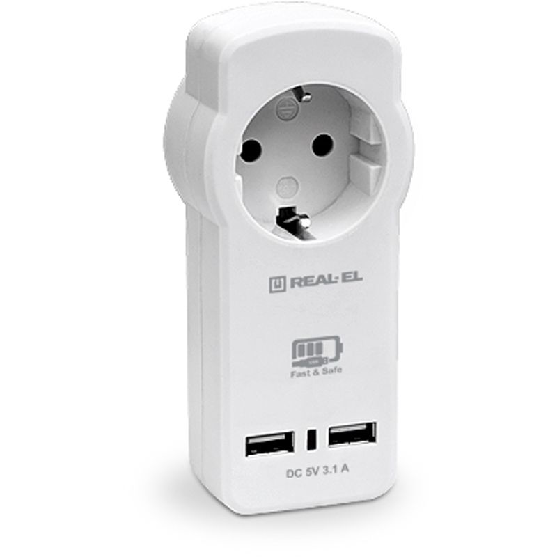 Мережевий зарядний пристрій з розеткою REAL-EL CS-30 (2USB, 3.1A) White
