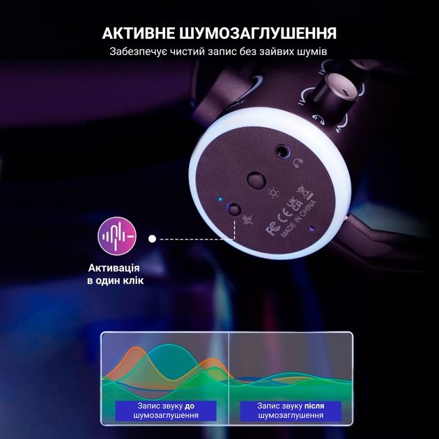 Копмплектація: USB-мікрофон з RGB та поп-фільтром, cтійка для мікрофону, стійка-пантограф, С-подібний затискач, USB-А - USB-C кабель довжиною 2.5 м.