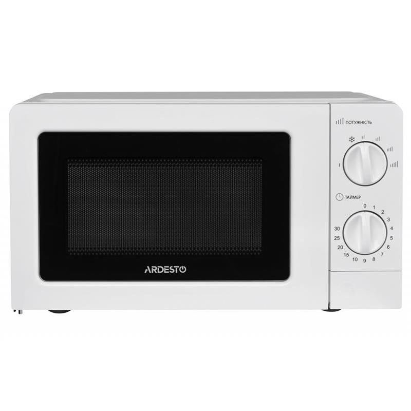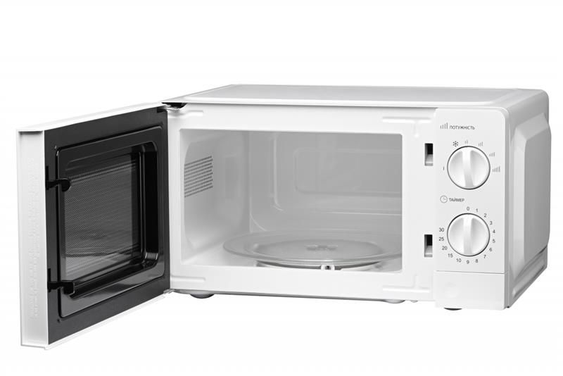 Мікрохвильова піч білого кольору з механічним управлінням. Потужність GO-S723W - 700 Вт, є шість рівнів регулювання, а внутрішній обсяг дорівнює 20 л.