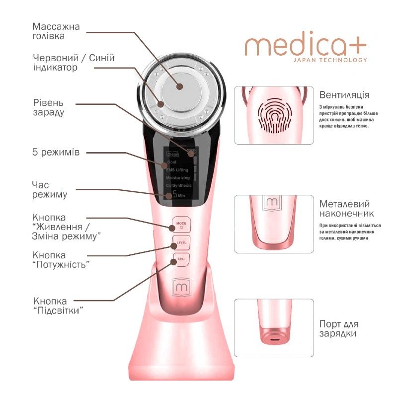 Поєднавши п’ять різних за принципом дії режимів застосування, японський виробник MEDICA+ створив абсолютно інноваційний, універсальний,надійний та безпечний пристрій для домашнього догляду за шкірою обличчя – мікрострумовий ліфтинг-масажер для обличчя MEDICA+ SKIN LIFTING 7.0 PINK (EMS+LED). З ним салонні косметологічні процедури в домашніх умовах стали доступними, а поєднання найсучасніших технологій – світлових хвиль та електричних мікроімпульсів в комплексі мають потужний корисний вплив на шкіру. Модель має Український сертифікат СЕС, Європейський ISO/SE/Rohs та Американський FDA.