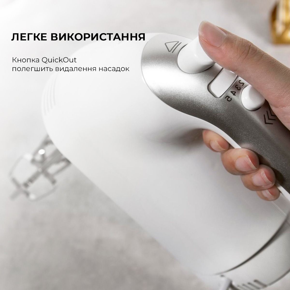 Занурювальний міксер CECOTEC PowerTwist 500 оснащений кнопкою QuickOut, яка дозволяє легко приєднувати насадки та швидко від'єднувати їх, не торкаючись робочої зони.