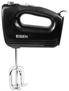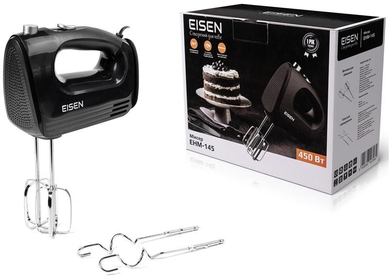 Сучасна модель EISEN EHM-145 представлена у класичному чорному кольорі. Корпус міксера виготовлений із якісного пластику, а вінчики для збивання та гаки для тіста – із нержавіючої сталі.