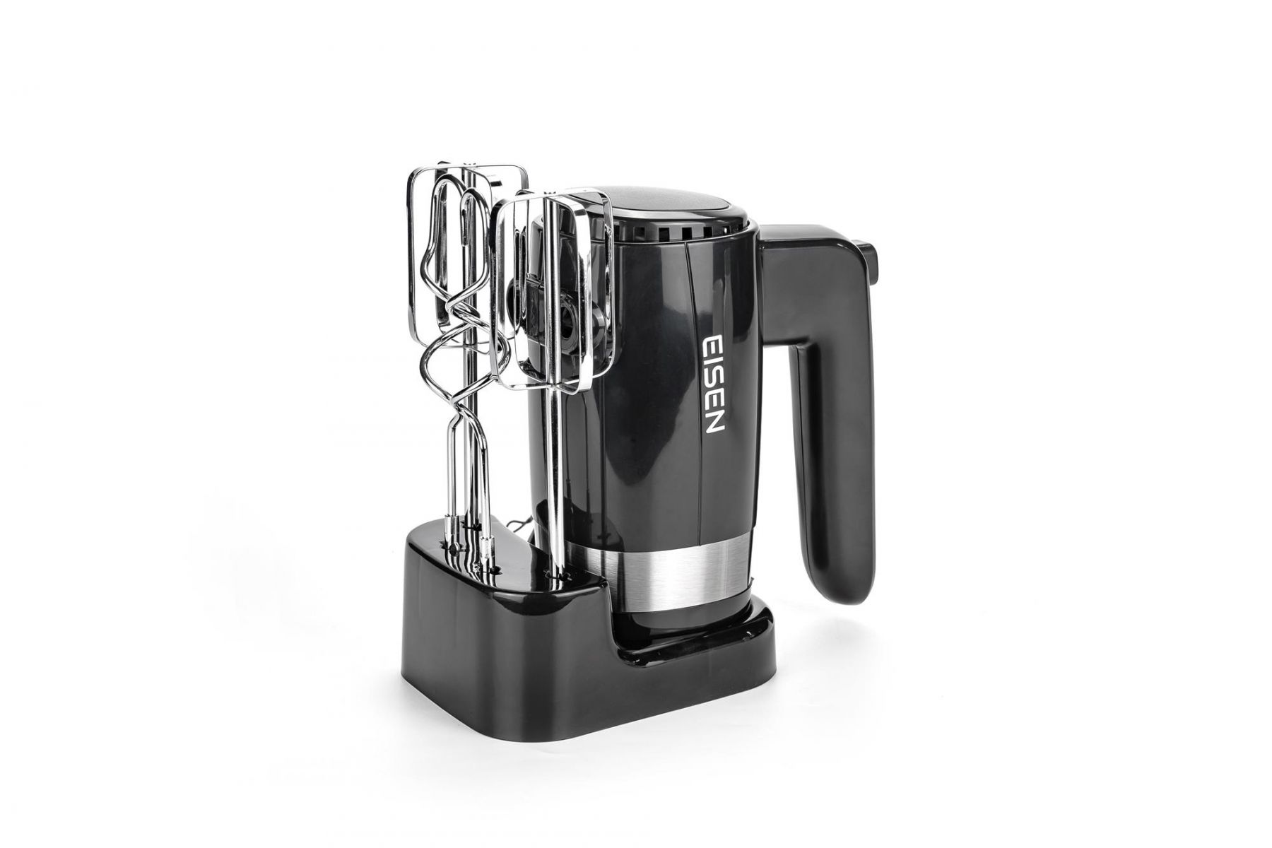 Ручний міксер EISEN EHM-50 є універсальною моделлю "2 в 1" і надійним помічником на кухні. Він має потужність 500 Вт і швидко впорається з різними кулінарними завданнями. У нього є два вінчика для збивання та два гаки для тіста, а також п’ять ступенів регулювання швидкості та турбо-режим. Головною особливістю цієї моделі є підставка для зберігання міксера та насадок. Щоб забезпечити безпечну роботу пристрою, він має функцію захисту від перегріву.