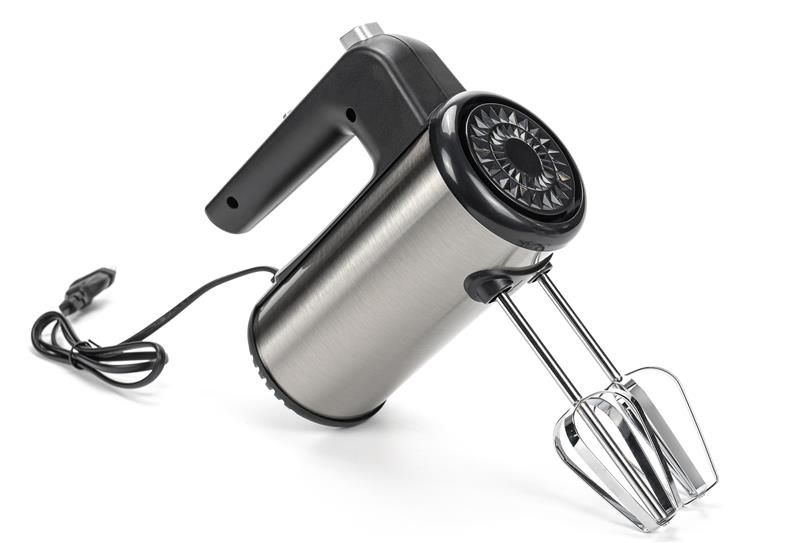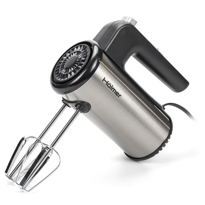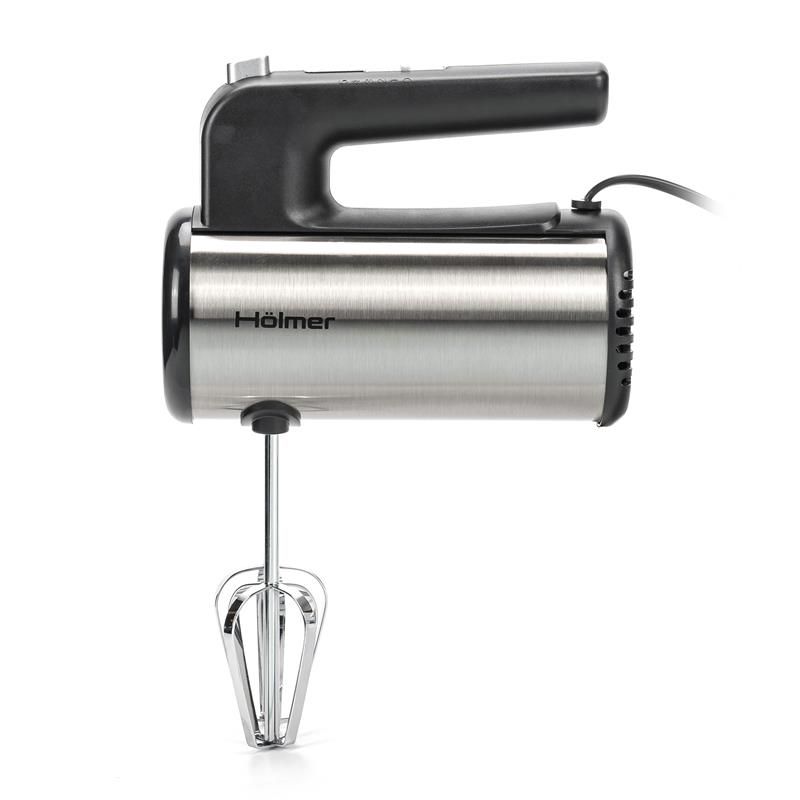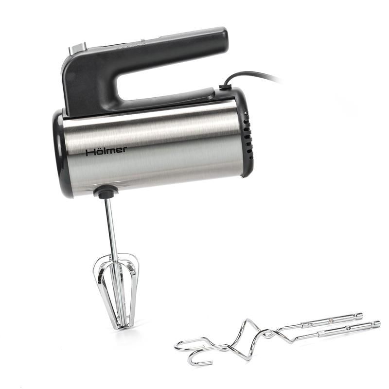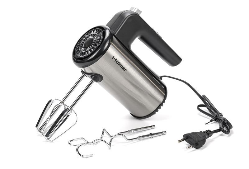Модель Holmer HHM-45 покращеної ергономічної форми представлена у кольорі металік. Корпус міксера виготовлений з якісного пластику, а потужні вінчики для збивання та гаки для замішування тіста – хромованої сталі.