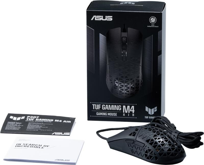 TUF Gaming M4 Air - це ультралегка дротова ігрова миша, оснащена високоточним оптичним сенсором з роздільною здатністю 16 000 точок/дюйм. Її легко персоналізувати на свій смак, запрограмувавши шість наявних кнопок. Налаштування пристрою зберігаються в трьох профілях у його власній внутрішній пам'яті. Дана модель важить всього 47 грамів, але має досить міцну конструкцію. Для забезпечення легкого і плавного ковзання вона забезпечена гнучким кабелем Paracord і тефлоновими ніжками. Крім того, це - гігієнічний пристрій, адже його поверхні оброблені спеціальним антибактеріальним покриттям ASUS.