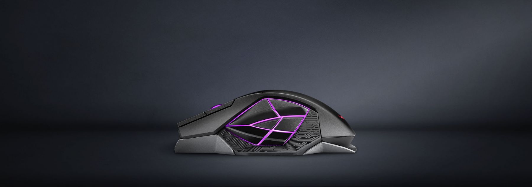 Бездротова ігрова миша з дворежимним підключенням (дротяна / 2,4 ГГц) з магнітною зарядною підставкою, 12 програмованими кнопками, спеціально налаштованим сенсором ROG 19 000 точок на дюйм, ексклюзивними роз’ємами перемикачів Push-Fit, мікроперемикачами ROG, підсвічуванням ROG Paracord і Aura Sync RGB.