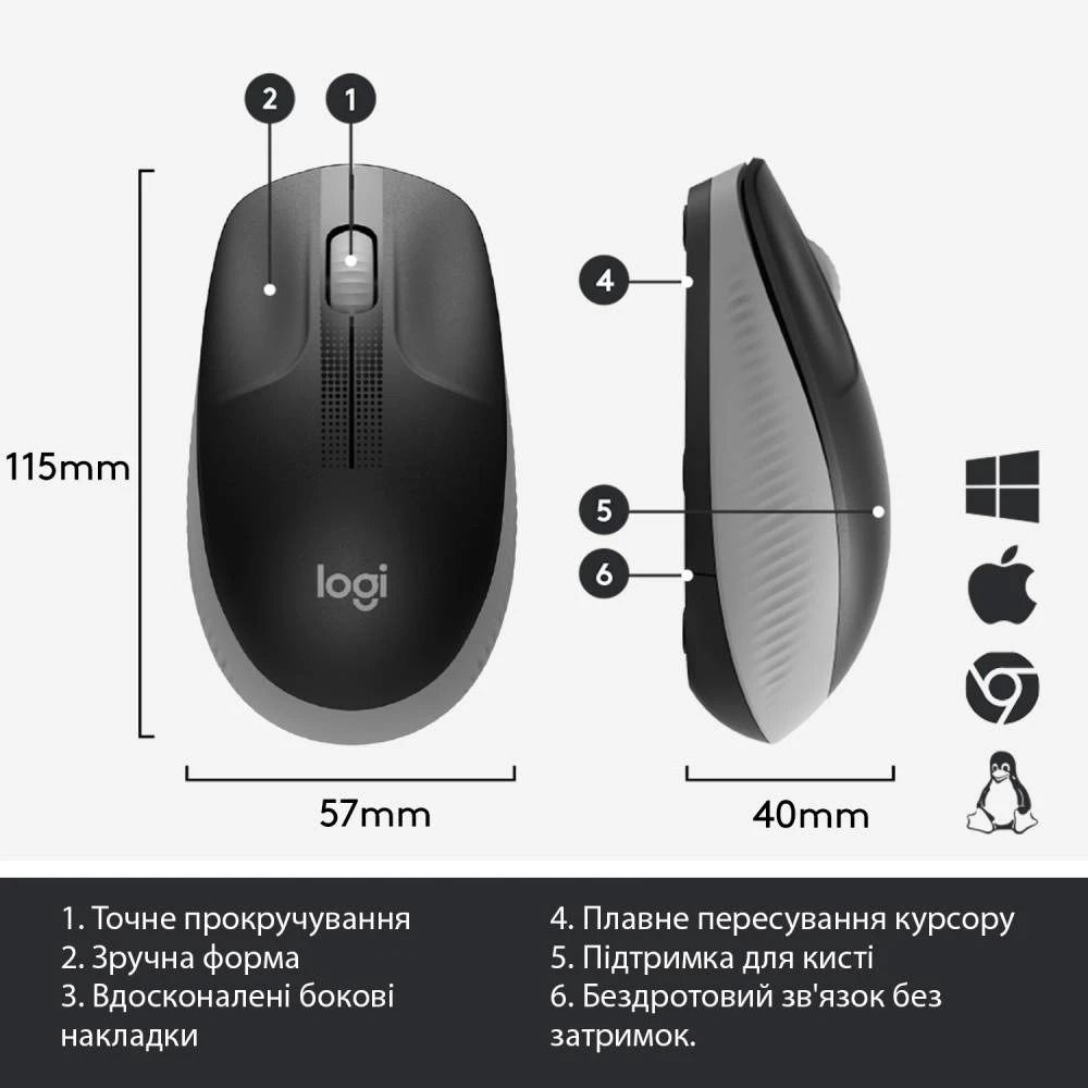 Завдяки зручній конструкції повнорозмірна бездротова миша Logitech M190 відповідає природній формі кисті середнього і великого розміру.