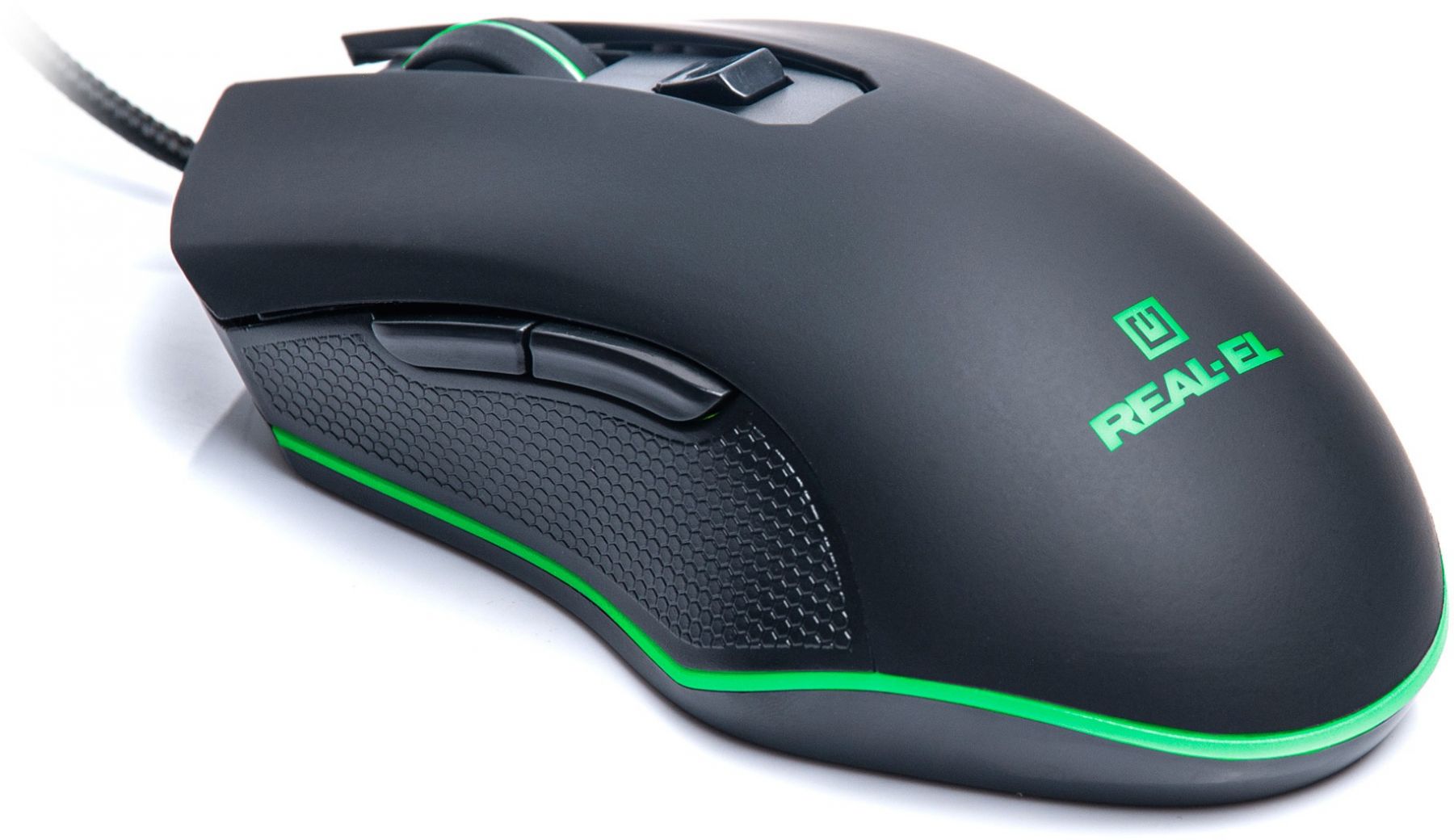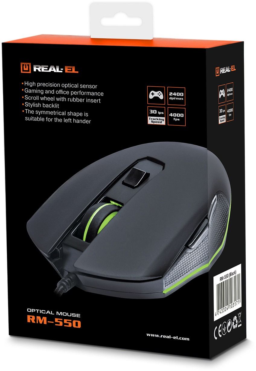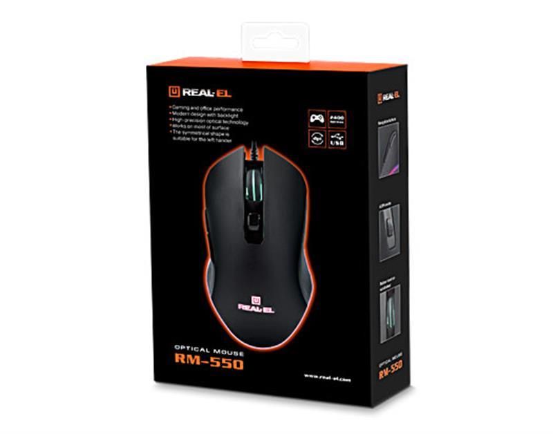 Високоточна оптична технологія дає змогу ігровій оптичній миші REAL-EL RM-550 працювати практично на будь-якій поверхні. Особливості: висока швидкість роботи, 5 + 1 клавіші, коліщатко прокручування, 2 кнопки навігації «вперед» і «назад», перемикач роздільної здатності, вмонтоване підсвічування.