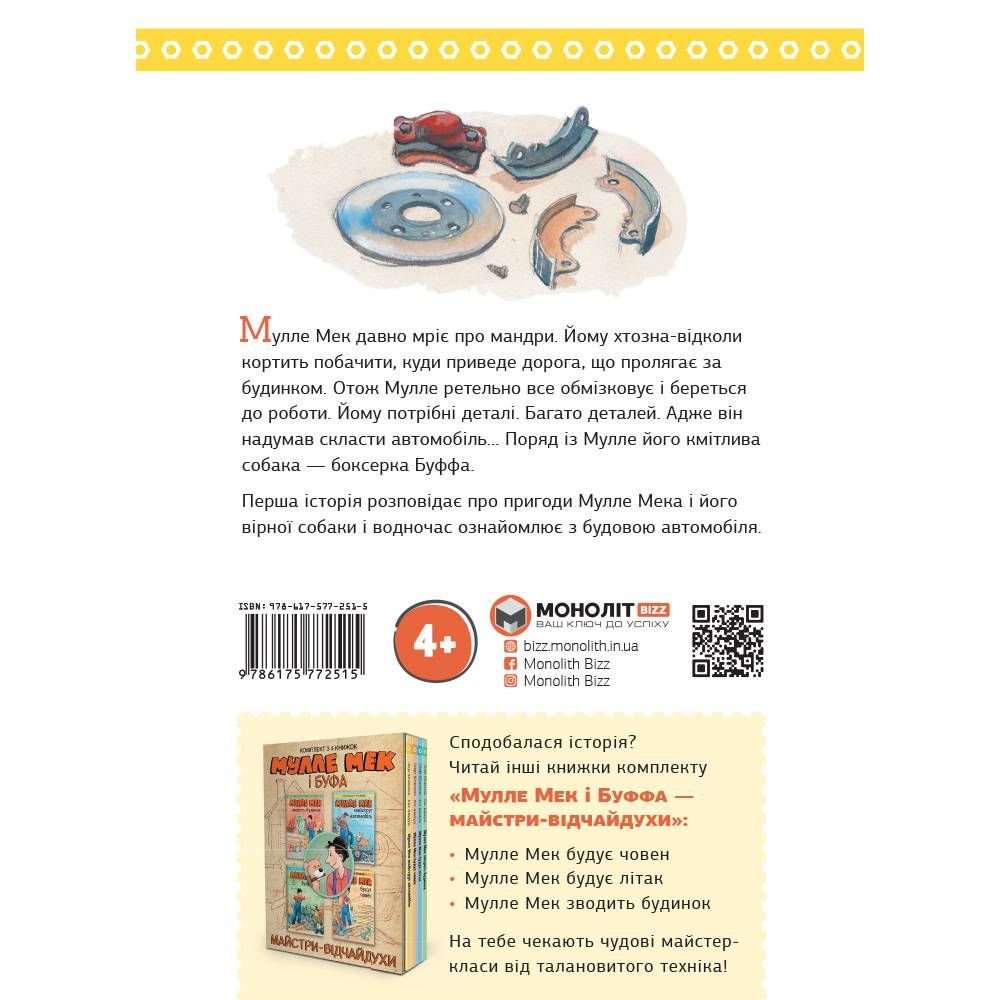 Як же іноді хочеться на якийсь час усе покинути і податися в мандри… То в чому річ? Сідайте в авто — і гайда в дорогу! А якщо немає автомобіля — не біда. Його можна зробити самотужки. Ось вам «інструкція» — добра й корисна книжечка «Мулле Мек майструє автомобіль».