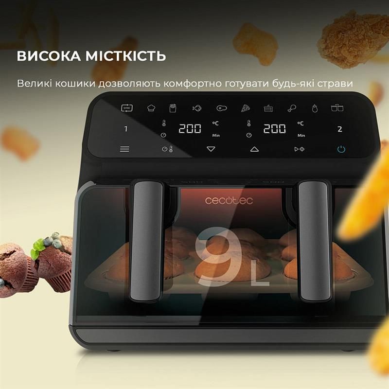 CECOTEC Cecofry Advance 9000 Window має великий 9-літровий контейнер для приготування та дозволяє з комфортом готувати будь-які страви, не турбуючись про те, що доведеться готувати кілька порцій.