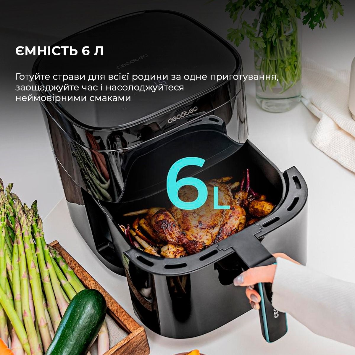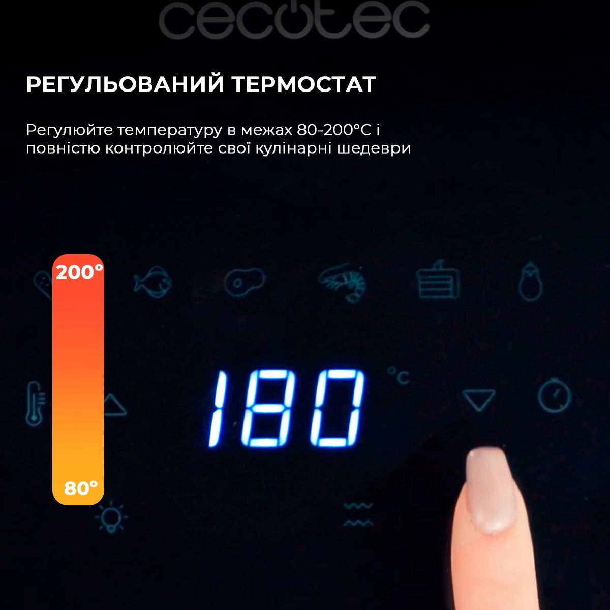Cecofry DuoHeat 6000 має широкий діапазон робочих температур, від мінімальних 80°C до максимальних 200°C, що дозволяє готувати різні продукти з урахуванням їх вимог до температури. Вона має місткість 6 літрів, що дозволяє приготувати велику кількість їжі за один раз.