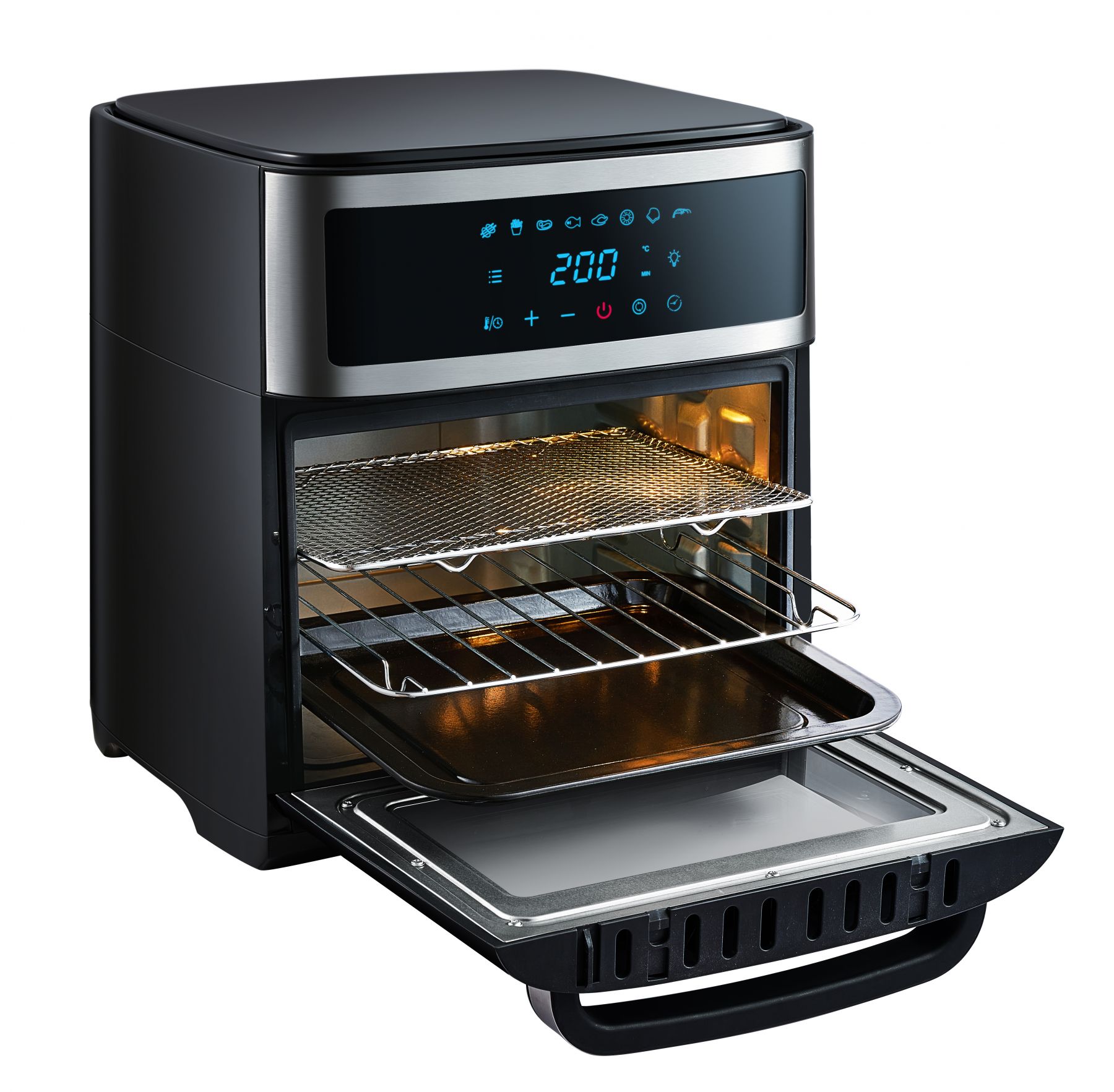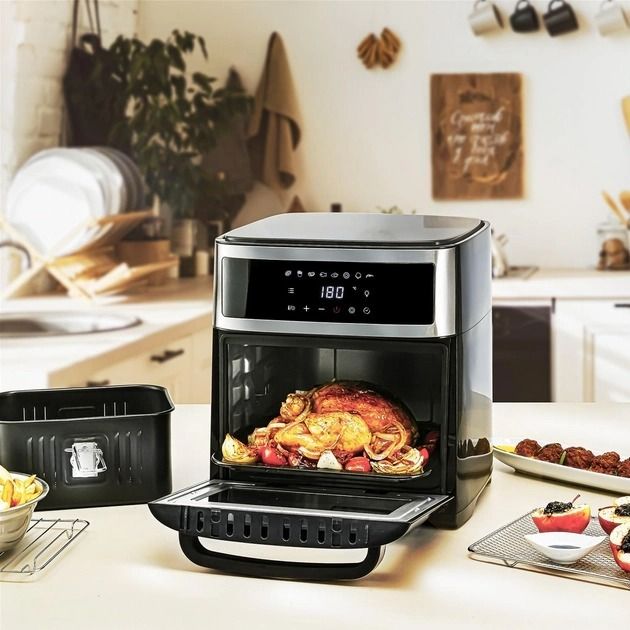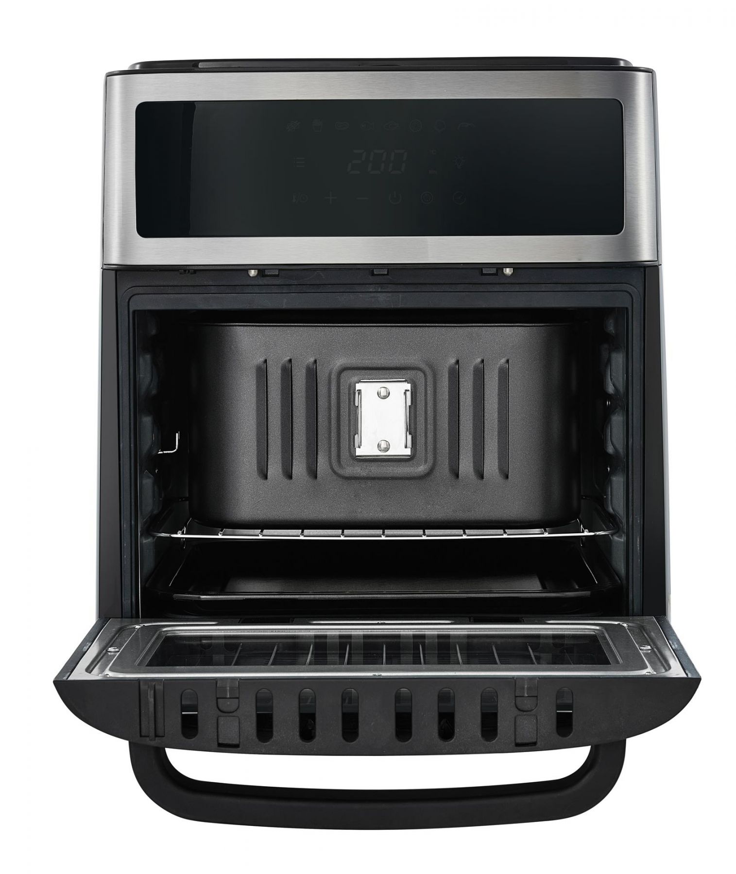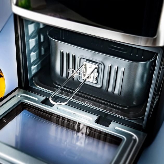 Прилад загальним об’ємом 13 літрів та цифровим керуванням неймовірно швидко працює зі свіжими та замороженими продуктами, не додаючи при цьому зайвого жиру. Їжа вражає. В комплект входять практичні аксесуари: грати для гриля, деко, грати для гриля та 4 сітчасті грати - вони забезпечують достатню площу поверхні для сушіння. Практичний додаток: дверцята можна зняти для полегшення чищення.