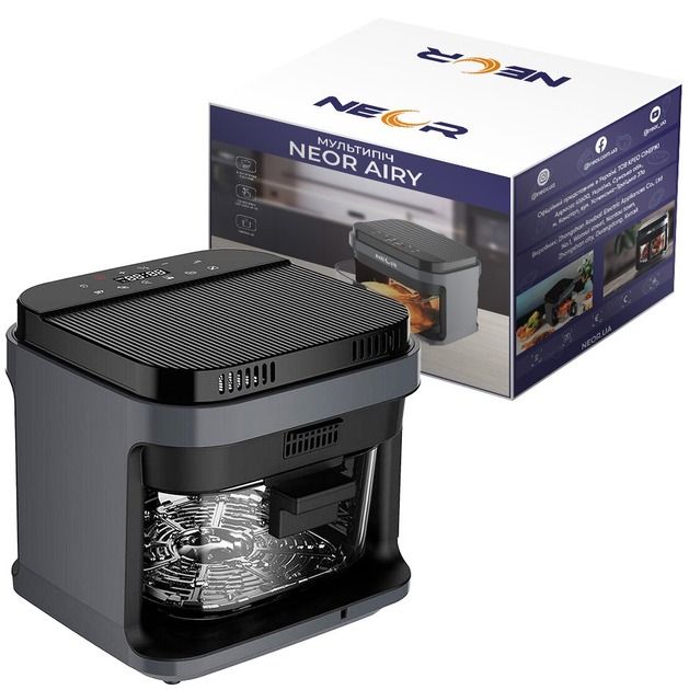 Корпус з нержавіючої сталі темно-сірого кольору у поєднанні з прозорим склом робить зовнішній вигляд мультипечі NEOR AIRY 5L12 CH привабливим та елегантним. Її розміри, 392 x 340 x 330 мм, дають можливість легко інтегруватися у будь-який кухонний простір. Змінна температура у межах 40-200 С дозволить готувати широке коло страв, не турбуючись про пригорання та сирий вміст.