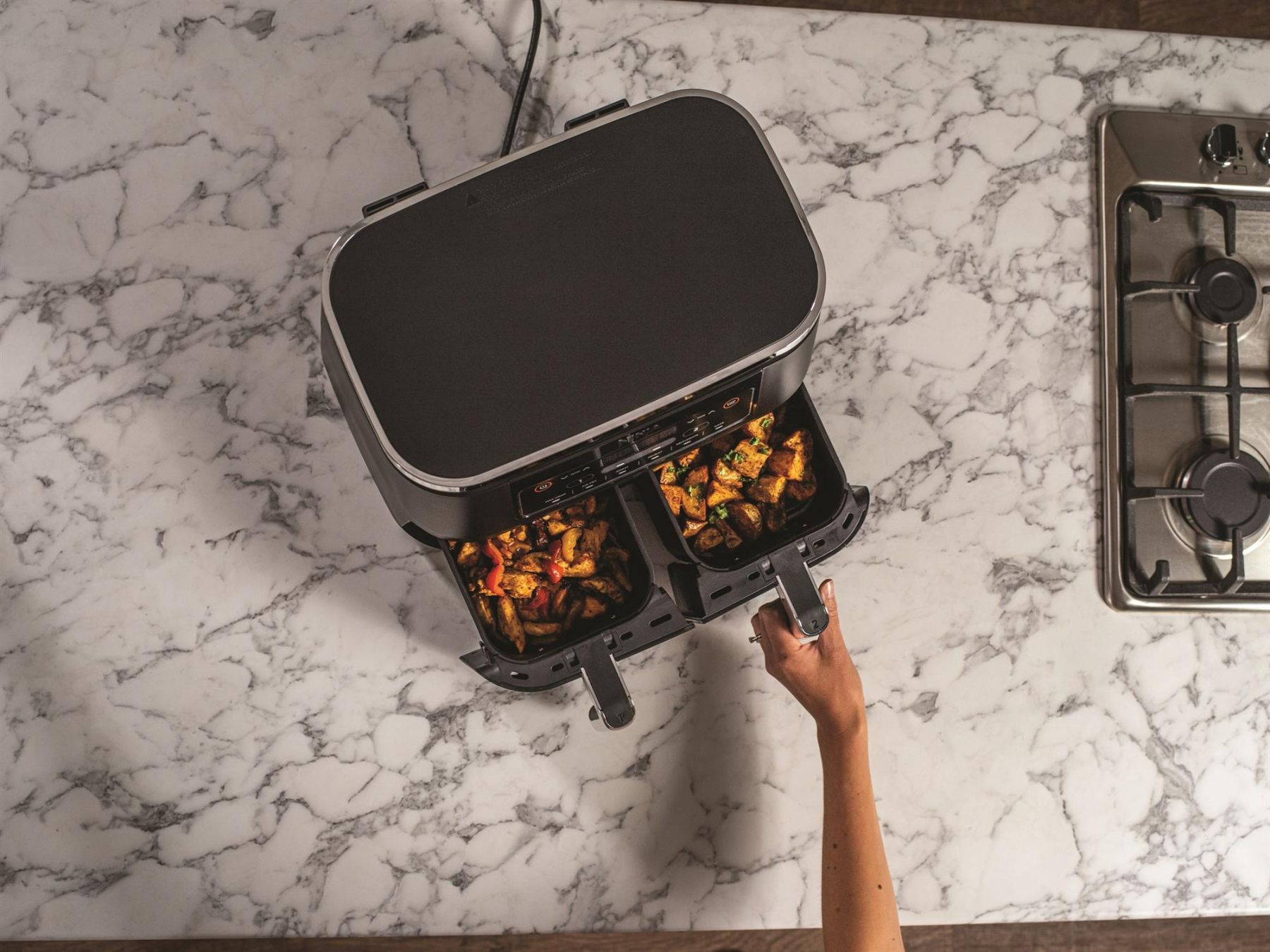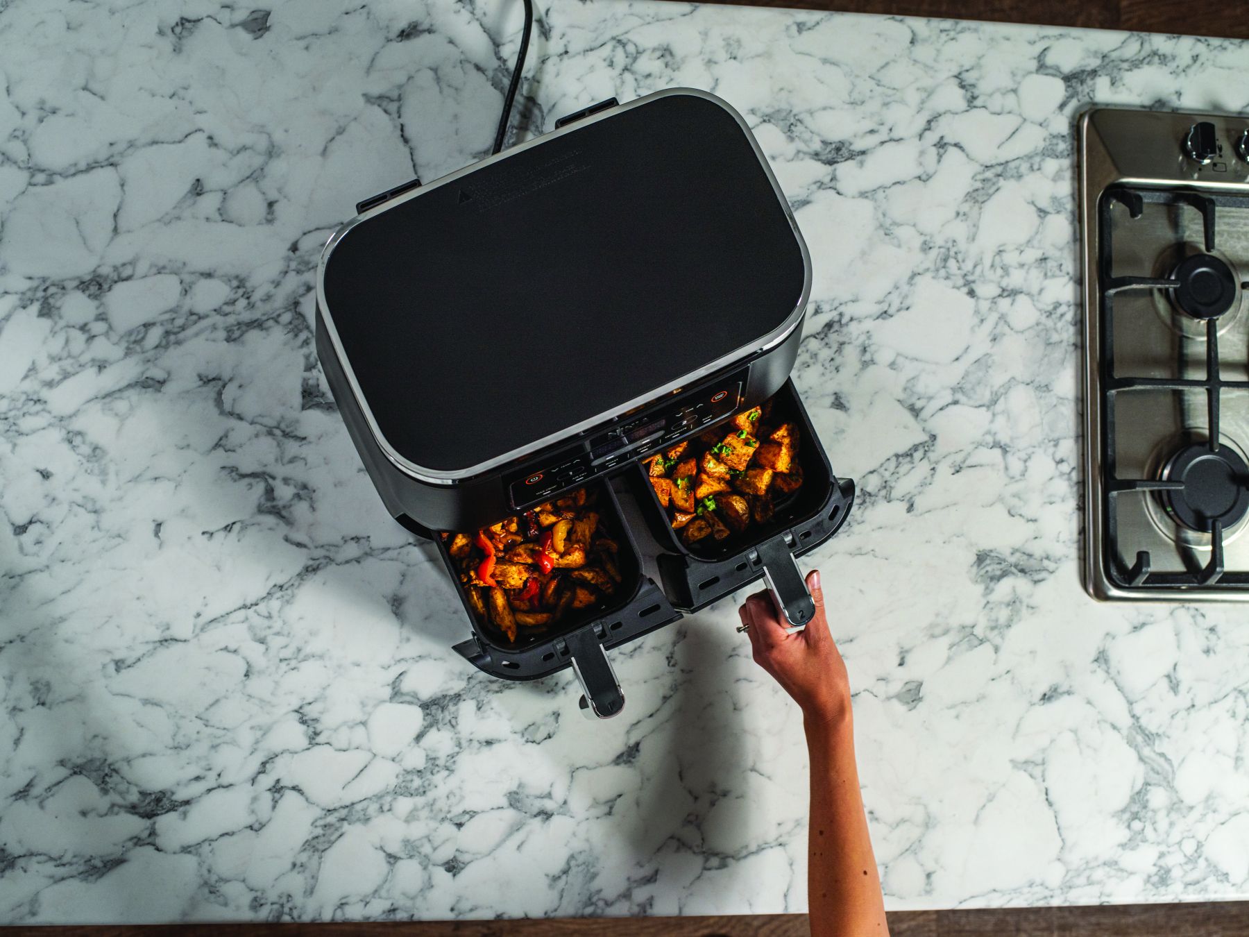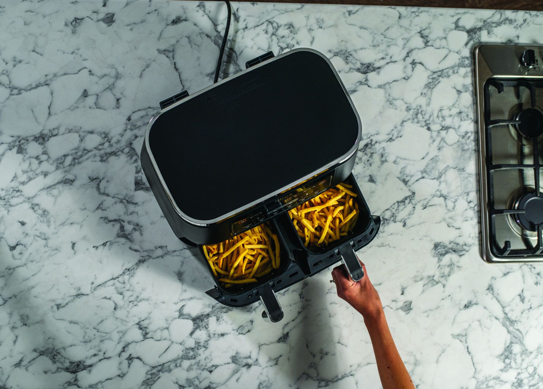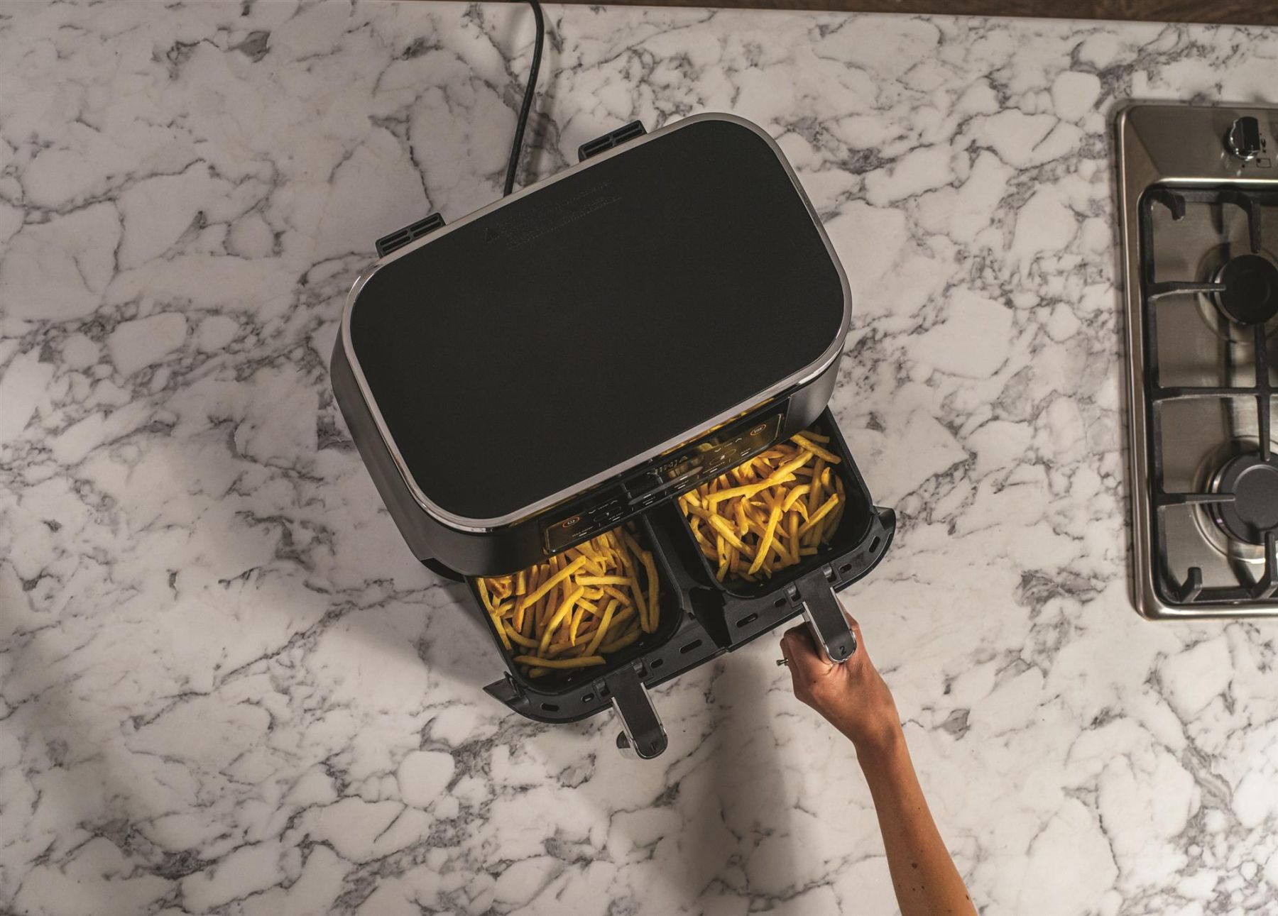Дві незалежні зони дозволяють готувати дві різні страви в різних режимах одночасно, наприклад, в одній зоні смажити картоплю фрі з функцією Air Fry, а в іншій запікати курку