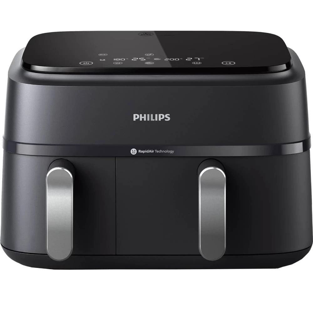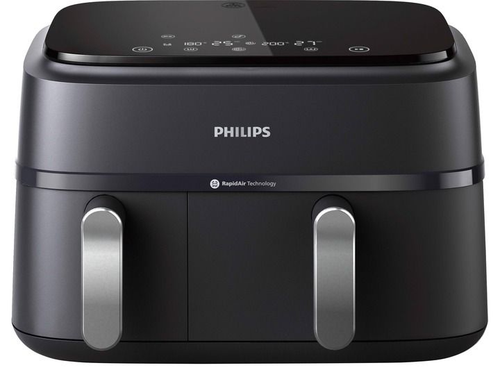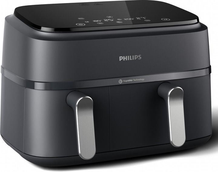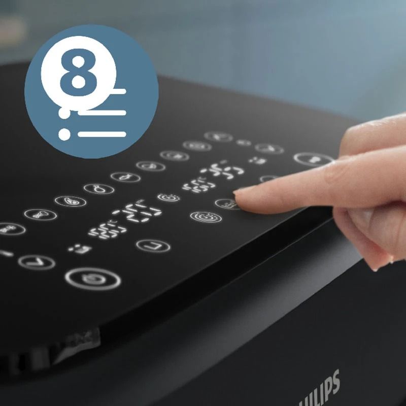 Сенсорний екран з 8 налаштуваннями для легкого приготування. Більше не потрібно перевіряти чи гадати. Завдяки сенсорному дисплею аерофрітюрниця з подвійним кошиком має попередньо встановлені температуру та час для приготування свіжої та замороженої картоплі фрі, курки, м’яса, овочів, риби, тістечок та розігріву.