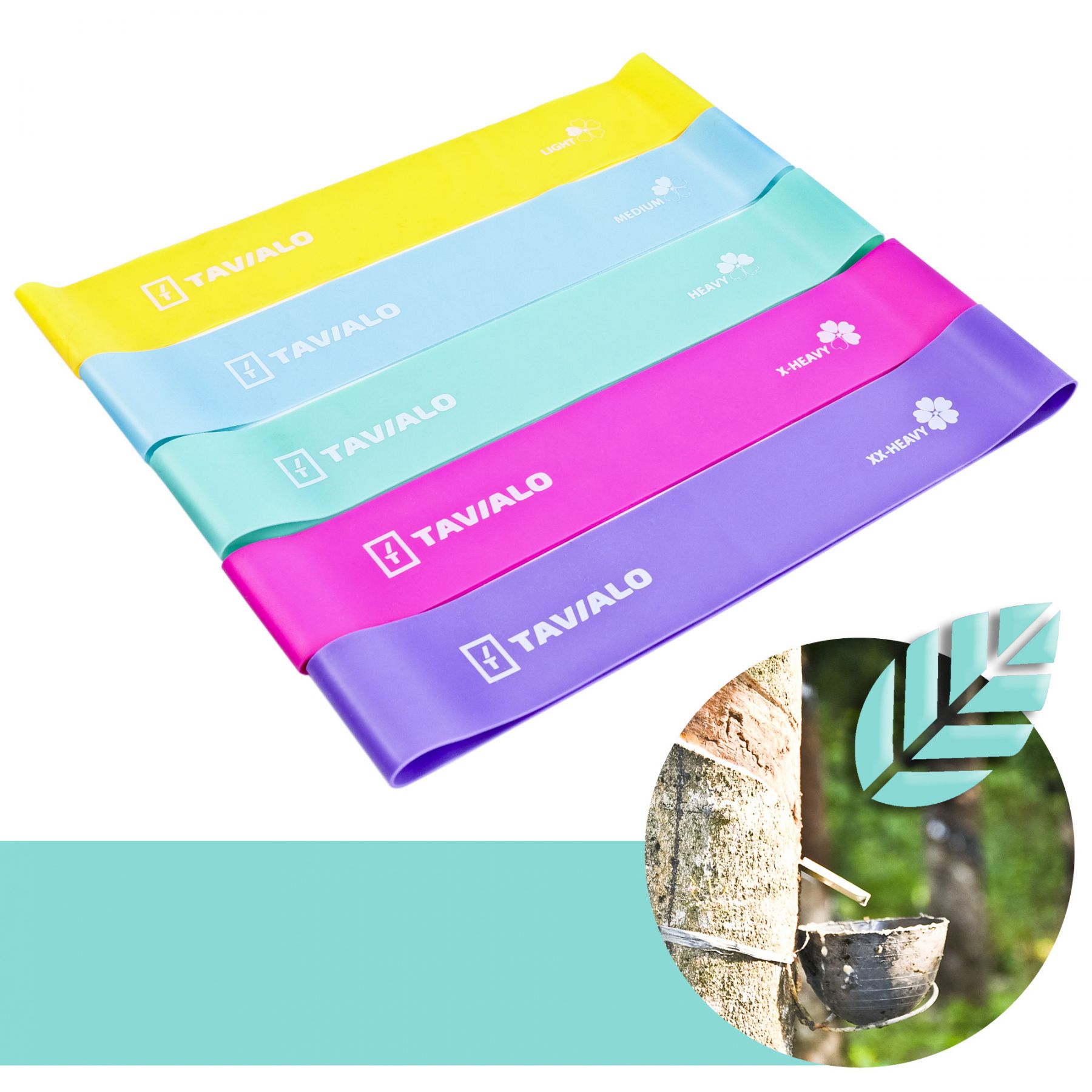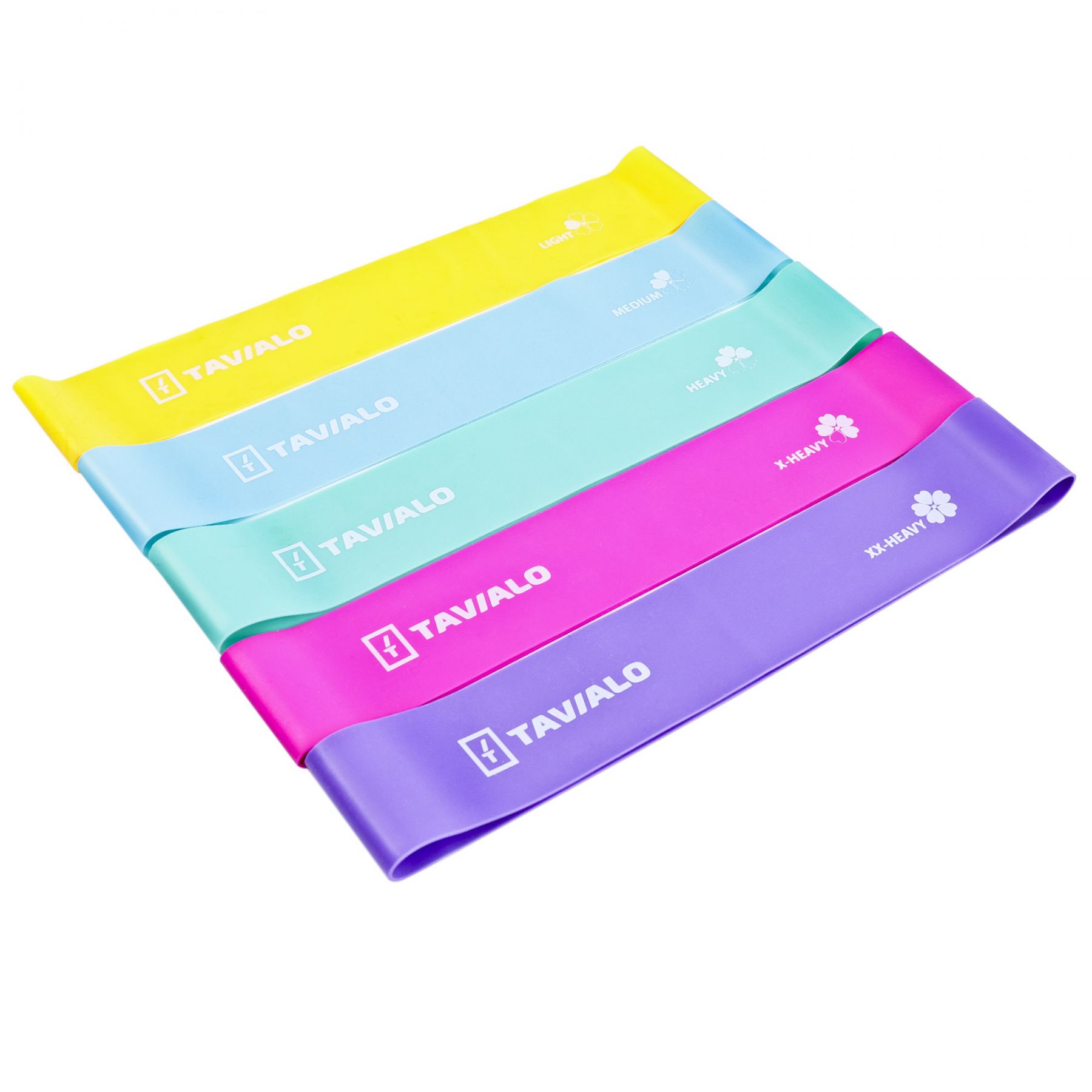 У набір фітнесу гумок TAVIALO входить 5 гумок з різним рівнем навантаження + 1 еспандер. Їх можна легко розрізнити за кольорами, кожному кольору відповідає певний рівень навантаження: