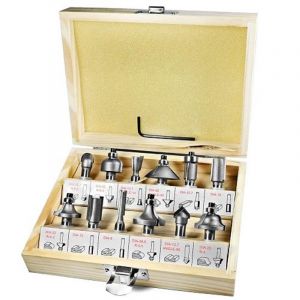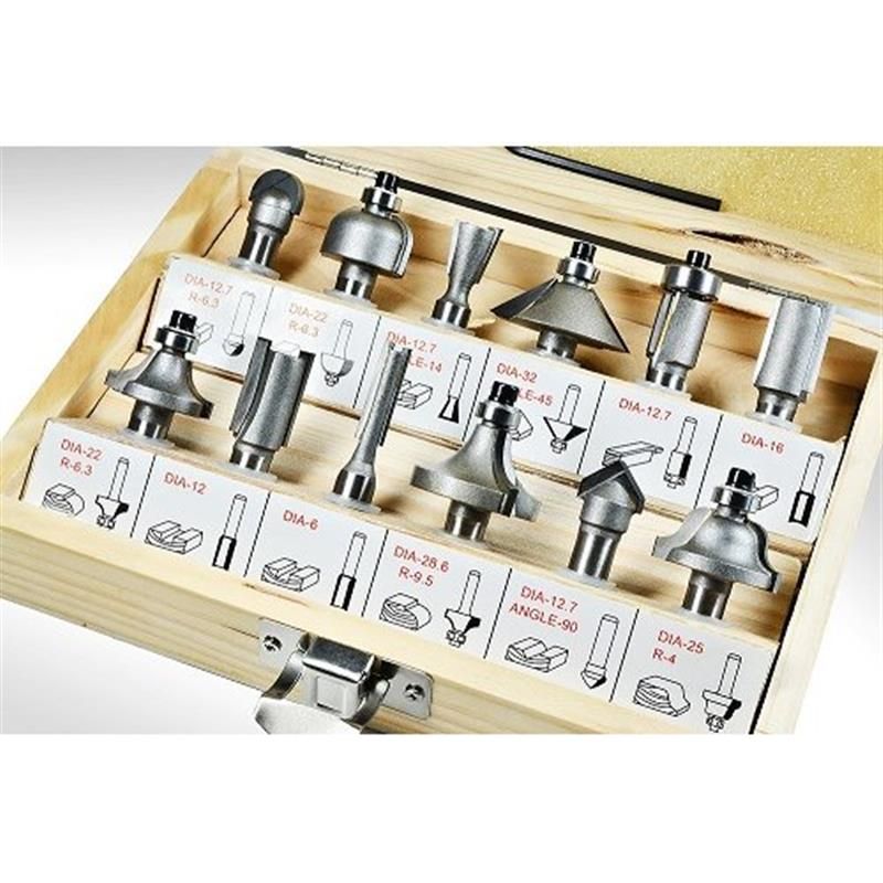 Набір фрез для фрезера: пазова пряма фреза, 8*6 мм, пазова пряма фреза, 8*12 мм, пазова пряма фреза, 8*16 мм, пазова V-образна фреза 8*12,7 мм, пазова шипова фреза 8*12,7 мм, кромкова конусна фреза 8*32 мм, кромкова пряма фреза 8*12,7мм, кромкова фреза 8*R6,3 мм, кромкова фреза 8*R9,5 мм, пазова галтельна фреза 8*R6,3 мм, кромкова фреза 8*R6,3 мм, кромова фігурна фреза 8*R4 мм.