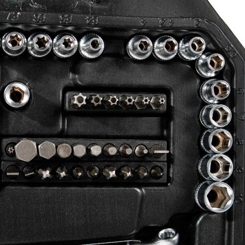 Розмір 1/2 ": шестигранні головки (19 шт), зіркоподібні головки Е профіль (5 шт), тріскачка 45T (1 шт), подовжувач (2 шт), шарнір карданний (1 шт), свічкові головки (2 шт), перехідник з отвором 3/8 "(1 шт), комірець з шарніром (1 шт), комірець Г-подібний (1 шт).