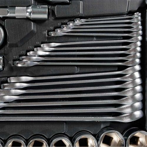 Комбіновані гайкові ключі (15 шт), розрізні ключі (5 шт), шестигранні ключі Г-образні (10 шт), молоток слюсарний 300 гр (1 шт), комбіновані плоскогубці 180 мм (1 шт), затискні кліщі 250 мм гейферний захоплення (1 шт), викрутки (6 шт).