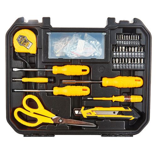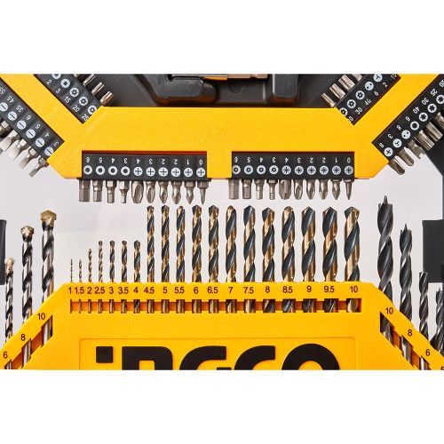 Набір налічує велику кількість необхідних предметів, а саме: свердла по бетону (6 шт), спіральні свердла по металу HSS (19 шт), свердла по дереву (6 шт), насадки-біти для викрутки довжиною 25 мм (52 шт), тримач біт (1 шт), свердла по дереву перові (3 шт), головки довжиною 48 мм (5 шт), зенківка 12 мм (1 шт), міні рівень спиртової (1 шт), ніж з комплектом змінних лез (1 шт), датчик глибини (4 шт), шестигранний ключ для датчика глибини (1 шт), вимірювач діаметру свердла (1 шт), молоток-обценьки 8 Oz (1 шт), головки торцеві змінні 1/4 "(10 шт), перехідник 4 -6 (1 шт), ручка з тріскачкою (1 шт), рулетка вимірювальна 3 м (1 шт), шестигранний ключ для датчика глибини (1 шт), коронка (1 шт), шестигранні ключі (8 шт).