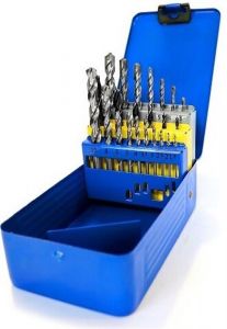 Спіральні свердла у кількості 23 штук поставляються у зручному металевому футлярі. Вони використовуються з електричним інструментом для обробки дерева, пластику, м’якого металу, що передбачає діапазон розмірів від 1.5 до 12 мм. Виконані із загартованої сталі з подальшою обробкою від корозії.