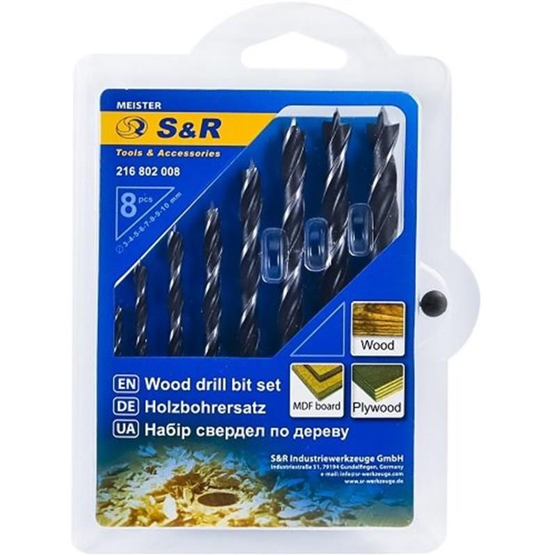 Набір свердл S&R Meister по дереву 8 шт. 3-10 мм - призначений для свердління заготовок з дерева, МДФ, фанери. У набір включені 8 свердл діаметром: 3, 4, 5, 6, 7, 8, 9, 10 мм. Кожне свердло виготовлено з якісної сталі, оброблено від корозії.