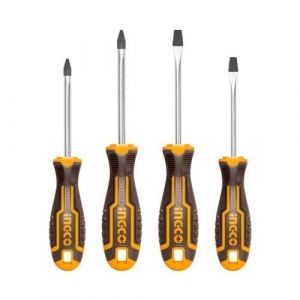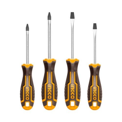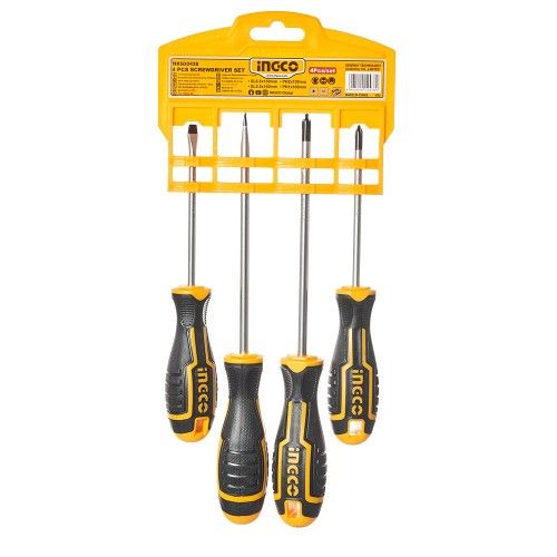 Набір викруток 4 од. INGCO містить у комплекті дві викрутки з прямим шліцем та дві викрутки з хрестовим. Інструменти дозволяють закручувати та відкручувати різні елементи кріплення.