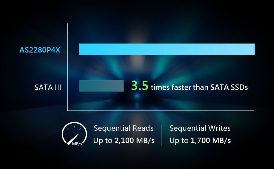 Цей твердотільний накопичувач використовує інтерфейс PCIe Gen3 x4 та флеш-пам'ять 3D. Він також сумісний із стандартом NVMe 1.3. Він забезпечує швидкість читання/запису до 2100/1700 МБ/с. Фактично, він у 3.5 рази швидше, ніж твердотільні накопичувачі SATA, та у 3.5 рази швидше, ніж традиційні жорсткі диски. Таким чином, кожен може насолодитися неймовірною швидкістю NVMe за чудовою ціною!