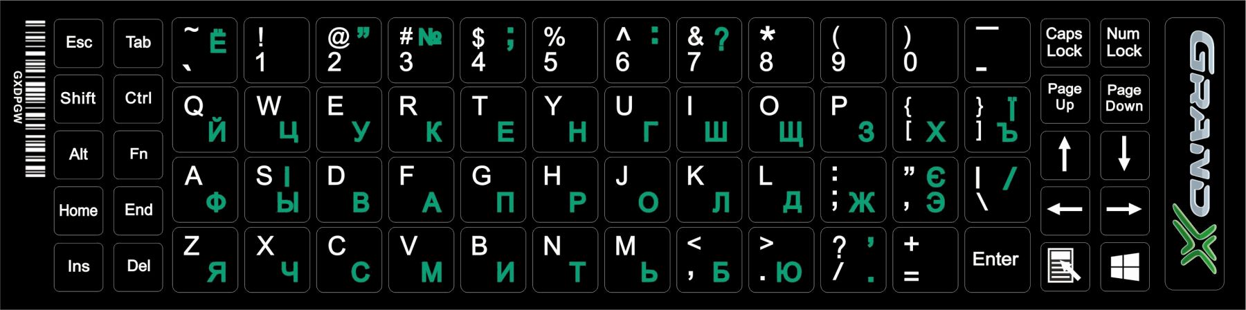 Наклейки на клавіатуру Grand-X protected 68 keys Cyrillic green, Latin white GXDPGW