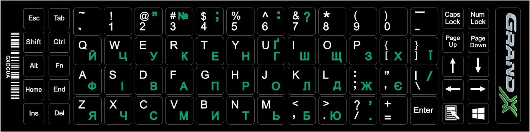 Наліпка на клавіатуру Grand-X 68 keys Green, Latin Ukr white (GXDGUA)