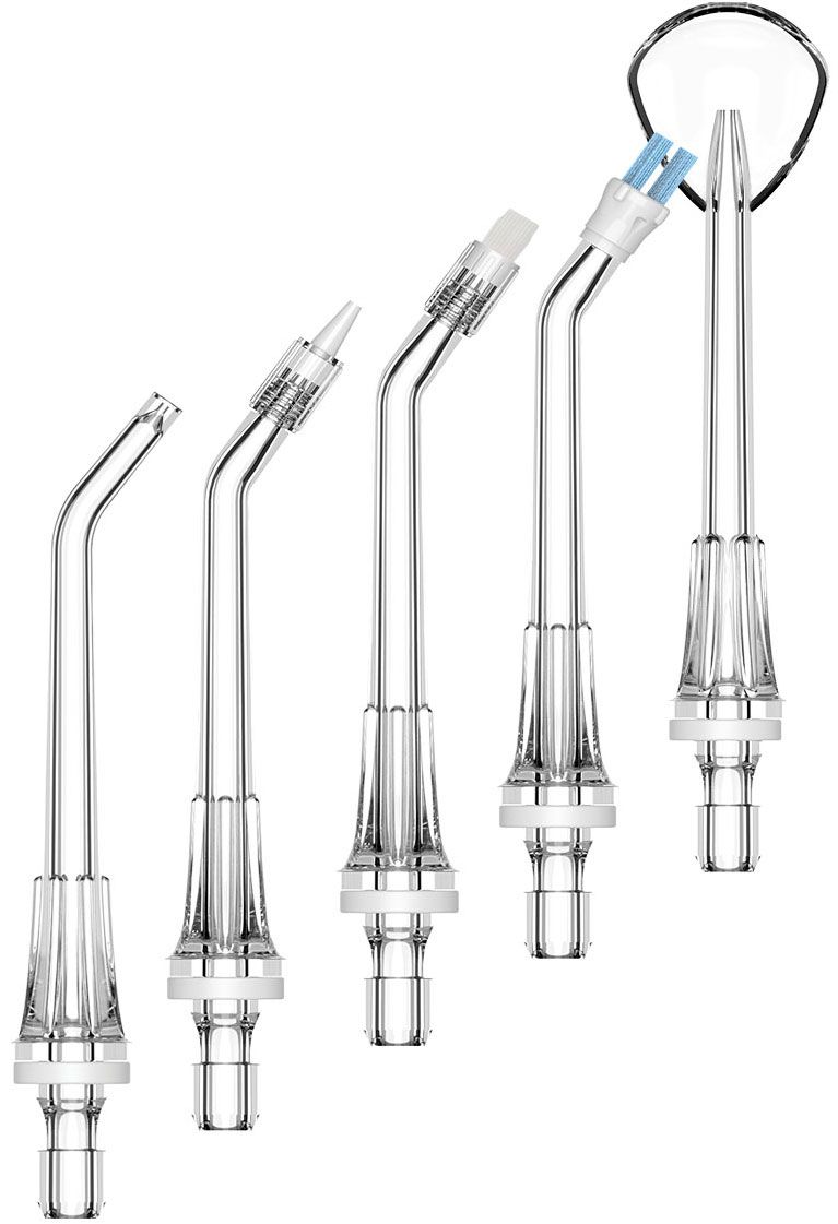 У наборі 5 функціональних насадок: 1 класична насадка, 1 насадка для видалення нальоту, 1 ортодонтична насадка, 1 пародонтологічна насадка, 1 ложка для очищення мови.