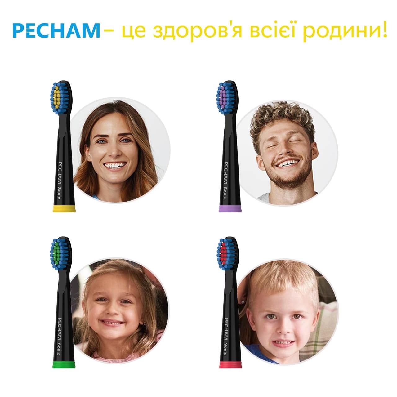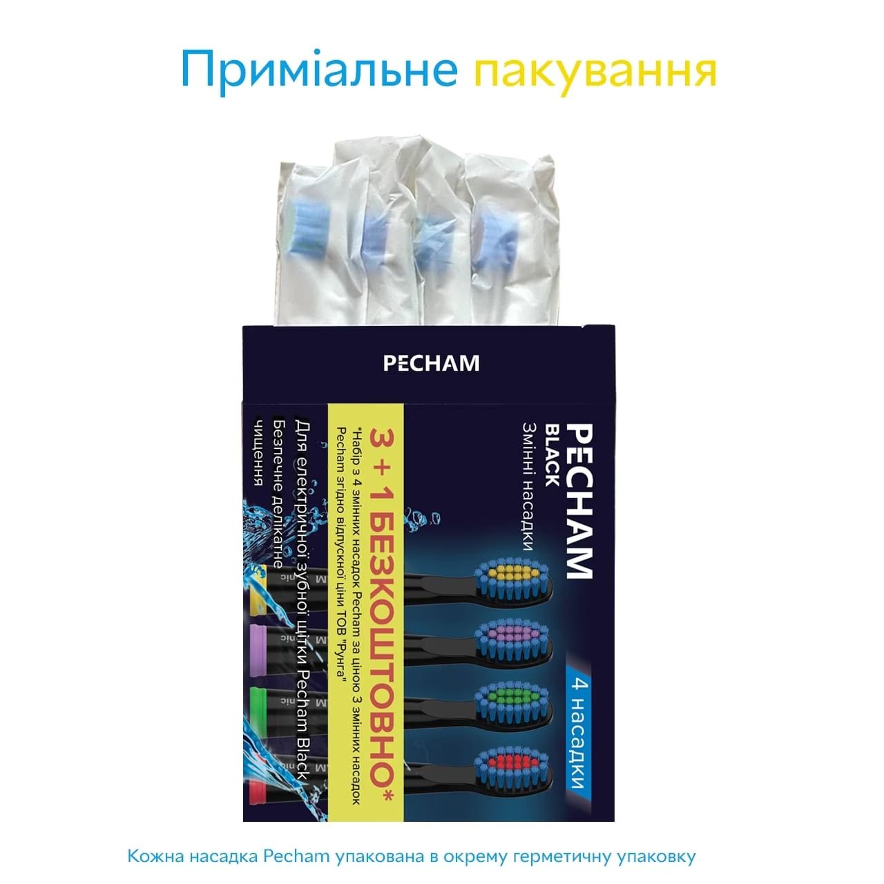 Всі насадки для щітки Pecham Black Travel мають кольорові смужки, що полегшить ідентифікацію, якщо насадками користуються кілька членів сім’ї.