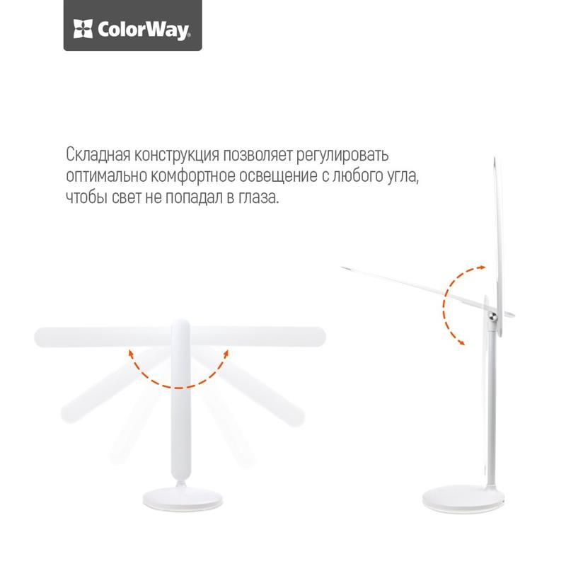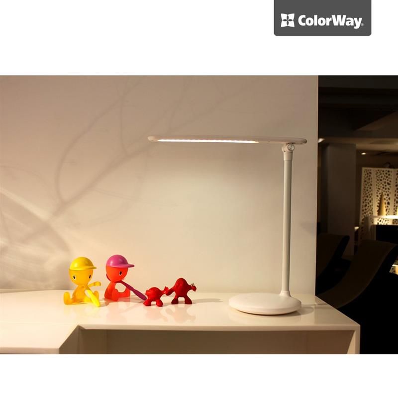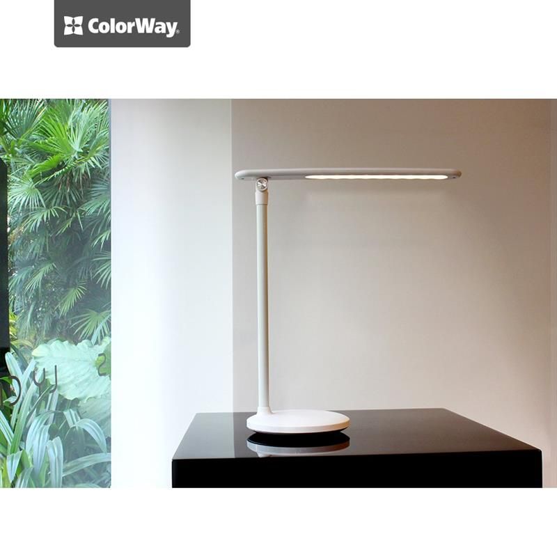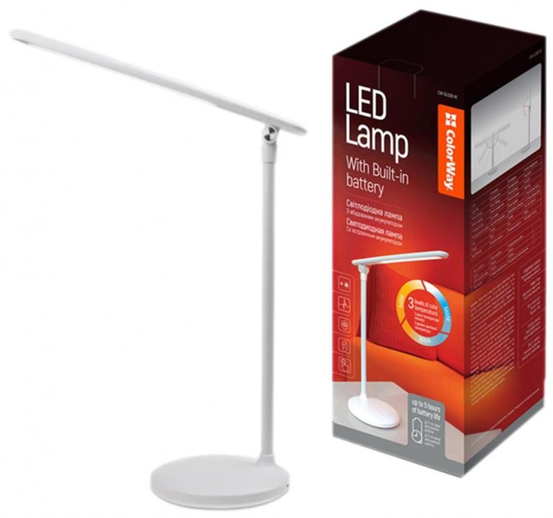 Настільна світлодіодна лампа ColorWay з вбудованим акумулятором. Стильний дизайн і функціональні можливості роблять лампу ColorWay не тільки елегантним елементом інтер’єру, але і незамінним аксесуаром, що допомагає підвищити продуктивність і ефективність роботи. LED лампа має вбудований акумулятор об’ємом 1800 mAh, який забезпечує до 4-х годин роботи без підключення до мережі, зарядити її можна від будь-якого джерела, оснащеного роз’ємом USB! Для підключення Вам не будуть потрібні додаткові спеціальні пристрої для зарядки, підійдуть роз’єми в комп’ютері, ноутбуці, зарядний пристрій для смартфона або PowerBank, це також просто, як зарядити телефон, що робить лампу по справжньому мобільною! Сенсорна кнопка на корпусі забезпечать безшумне і м’яке управління девайсом. Для забезпечення комфортної роботи передбачена можливість управління яскравістю і колірною температурою освітлення. Залежно від потреби, користувач може встановити: підвищуюче концентрацію холодне ранкове світло, оптимальне для читання і навчання нейтральне денне світло або заспокійлиююче та знімаюче стрес тепле жовте світло. Світлові елементи забезпечують рівномірне розсіювання світла.