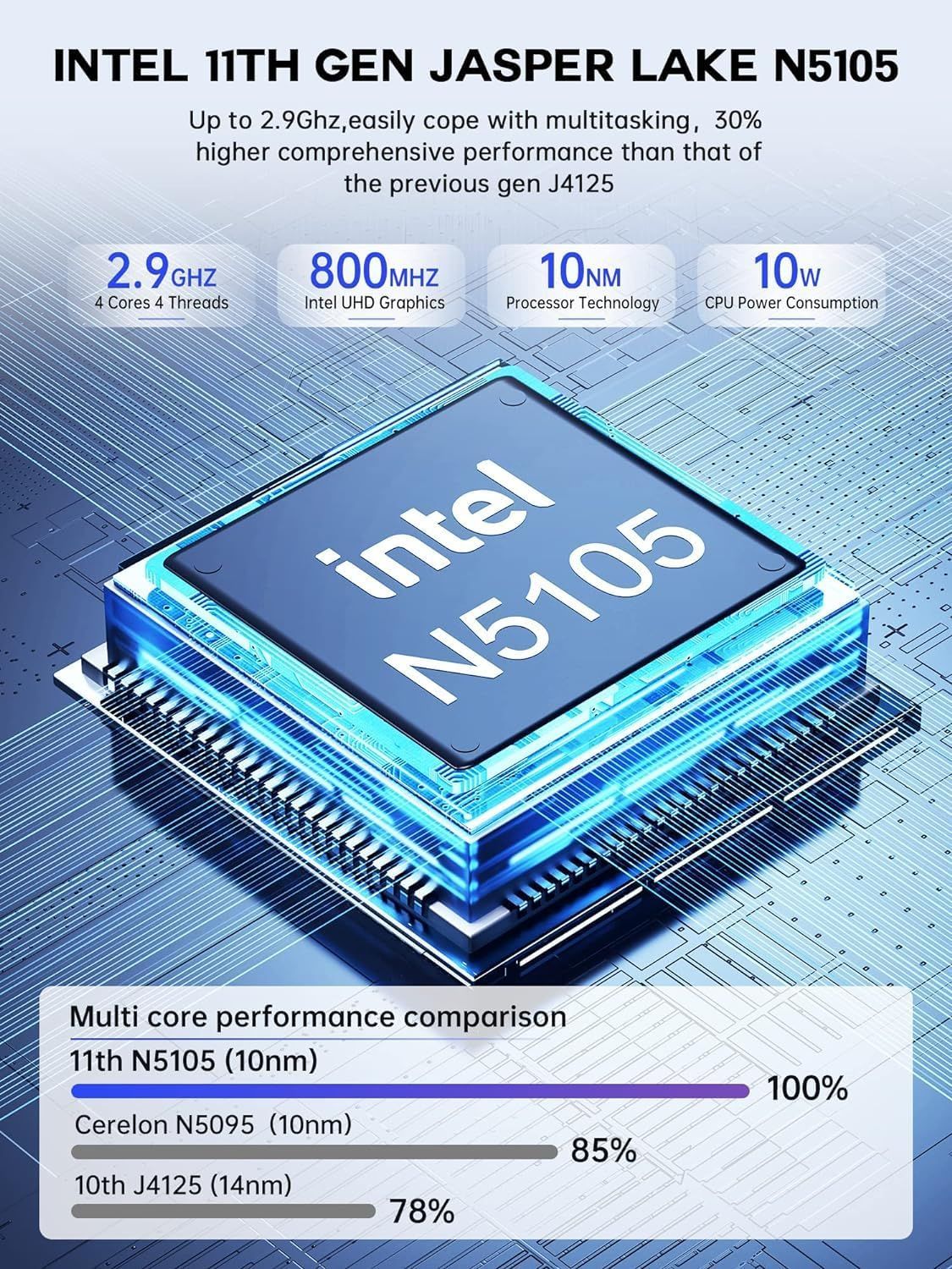 Міні-ПК ACEAGICIAN N5105 працює на базі процесора 11-го покоління Intel N5105 (4 ядра, 4 потоки, 4 МБ кеш-пам’яті, до 2,9 ГГц), який забезпечує неймовірну швидкість відгуку та більш плавну роботу порівняно з моделями J4125, J3455, J4205 і N3455. Цей процесор швидший і енергоефективніший, ніж N5095 з частотою 2,5 ГГц. Оснащений графікою Intel UHD (до 800 МГц, 24 одиниці виконання), він підтримує відтворення відео у форматі 4K і перегляд веб-сторінок, а також може бути підключений до проектора для використання як домашній кінотеатр.
