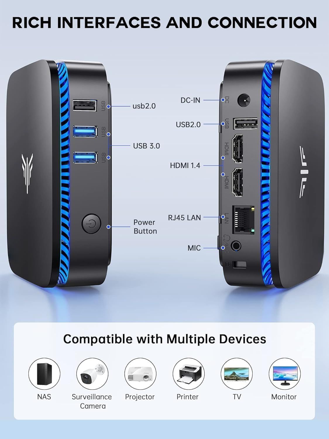 Міні-ПК постачається з попередньо встановленою Windows 11. Це ідеальне рішення для різних сценаріїв використання, таких як дім, розваги, офіс, онлайн-навчання та промисловість. Завдяки двом HDMI-портам ви можете підключити два дисплеї одночасно, що спрощує роботу та подвоює ефективність.