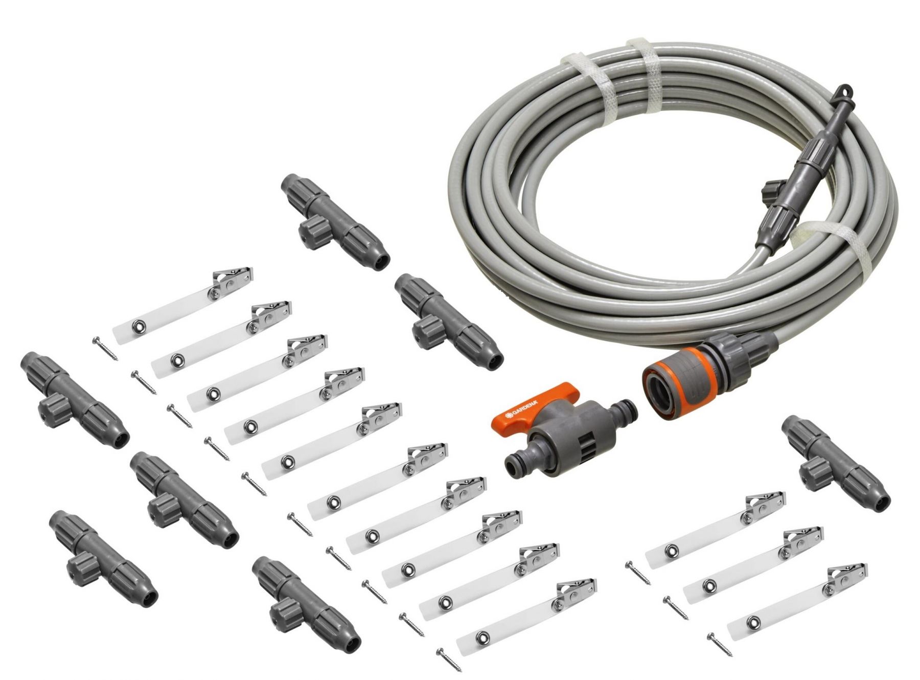 Набір складається з 10–метрового шланга внутрішнього діаметра 3,5 мм, 7 форсунок для дрібнодисперсного розпилення, 1 регулюючого клапана, 13 затискачів для кріплення і конектора для шланга та одразу ж готовий до використання і може бути модифікований додатковими елементами.