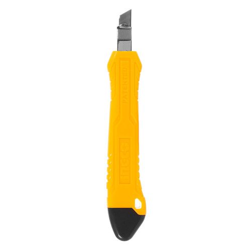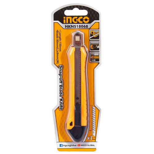 Ніж із сегментним лезом INGCO HKNS18068 призначений для різання паперу, картону, підлогових покриттів і інших матеріалів. Металеві напрямні гарантують тривалу службу. Для безпеки ніж забезпечений фіксувальною кнопкою і протиковзною накладкою. Двокомпонентне руків’я спеціальної форми забезпечує комфорт під час роботи. У комплекті є 1 лезо SK5 розмірами 80×9 мм. Довжина інструмента 150 мм. Ніж упакований у блістер.