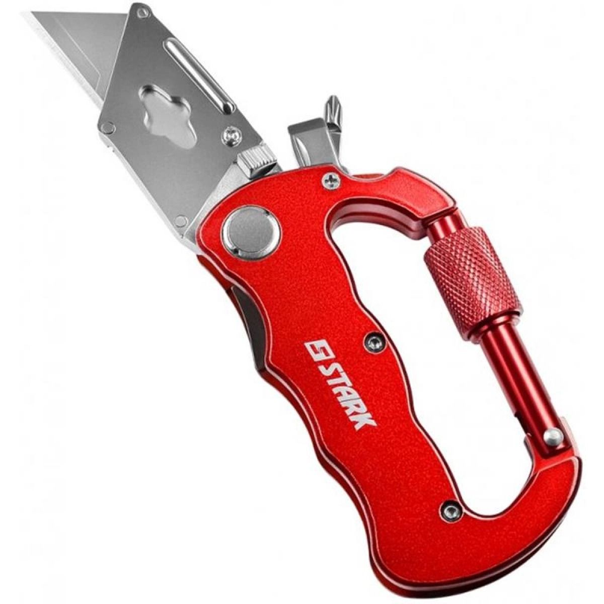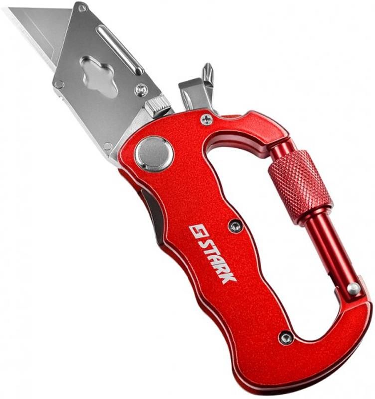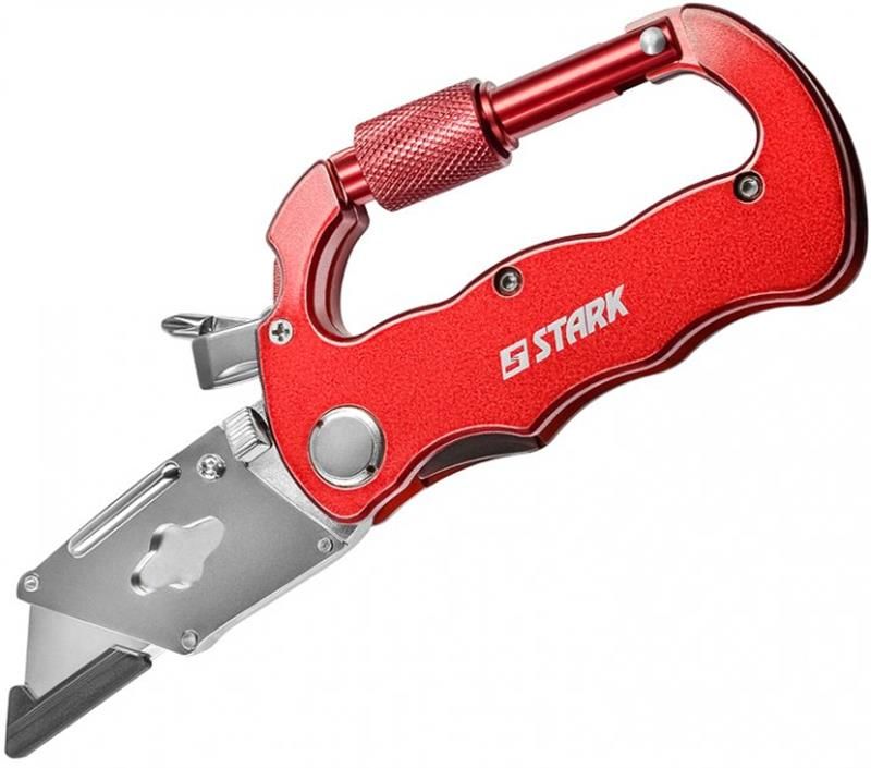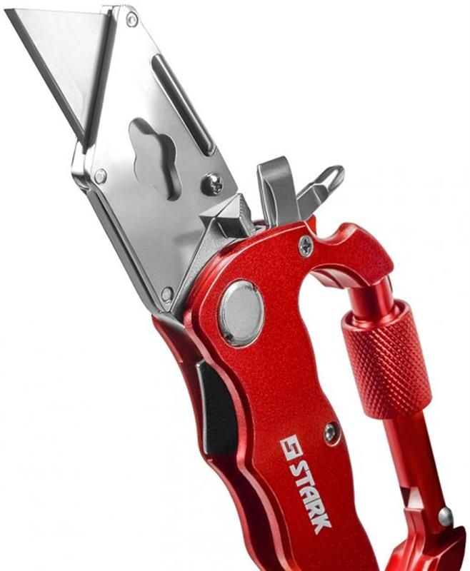 Ніж Stark трапецієподібний із карабіном — добре підійде для використання на природі, полюванні, риболовлі, у майстерні та під час ремонту. Трапецієподібне лезо, яке дуже легко замінити. Лезо складається в міцний металевий корпус із фіксатором. За допомогою карабіна ніж легко можна закріпити на поясі. Має викрутки PH і SL.