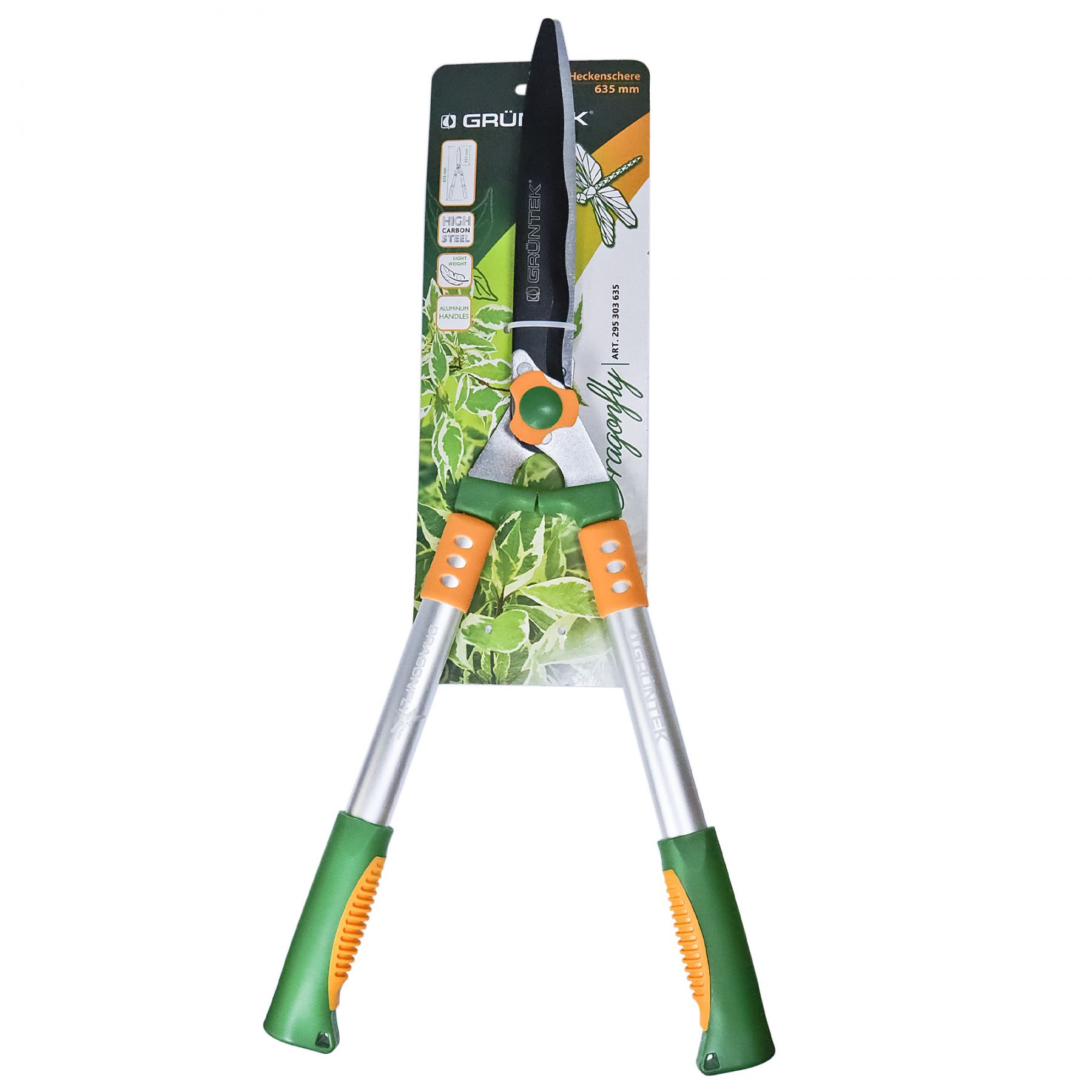 Рекомендовані для швидкого та зручного обрізання живоплоту. Леза довжиною 250 мм виготовлені із загартованої високовуглецевої сталі. Загальна довжина ножиць 635 мм. Хвиляста форма лез перешкоджають вислизу гілок і забезпечують оптимальний кут обрізки. Центральний гвинт дозволяє регулювати натяг та затискач лез. Алюмінієві рукоятки з двокомпонентними антиковзкими накладками роблять ножиці легкими та зручними.