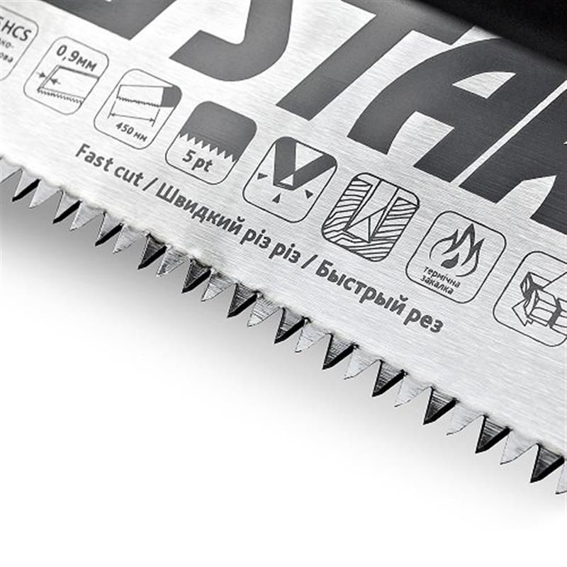 Stark 450 мм - ножівка для роботи з деревом, легко відпиляє гілки з дерев, розпиляє дошку або будь-яку іншу дерев’яну заготовку. Полотно з 5 зубцями / дюйм великого розміру для швидкого різу.