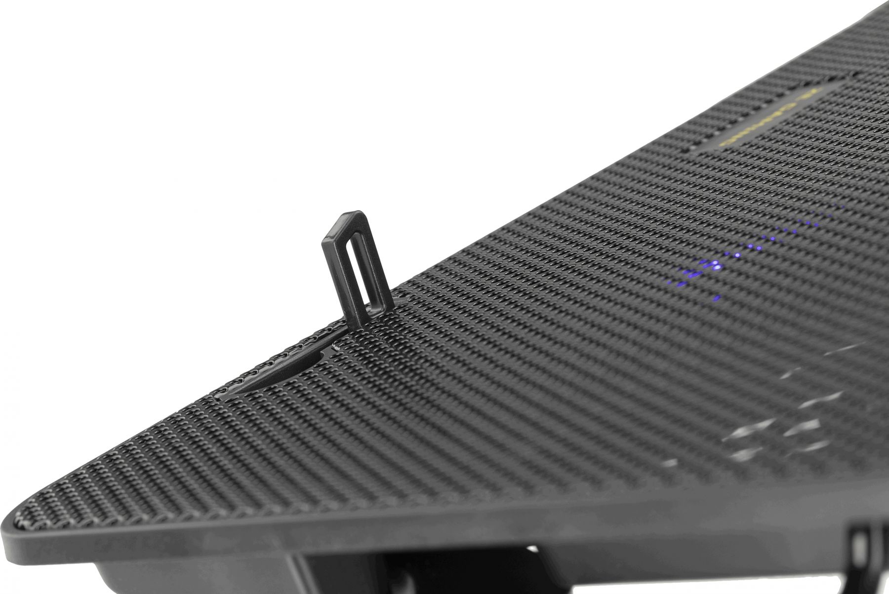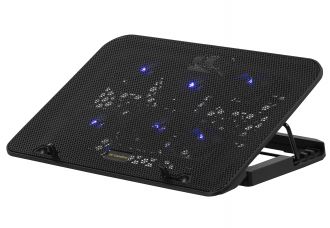 Компактний та стильний корпус із міцного пластику та металевої перфорованої поверхні доповнений шістьма потужними вентиляторами з LED-підсвічуванням, які забезпечують ефективне охолодження ноутбуків діагоналлю до 15,6 дюймів. Антиковзкі прогумовані ніжки забезпечують стійку фіксацію підставки на столі.