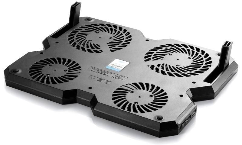 Чотири вбудовані вентилятори створюють потужний повітряний потік, який не залишає жодної «сліпої зони». Це дозволяє однаково ефективно охолоджувати й ділянку корпусу, де знаходиться накопичувач ноутбука, і ділянку, де розташована відеокарта.