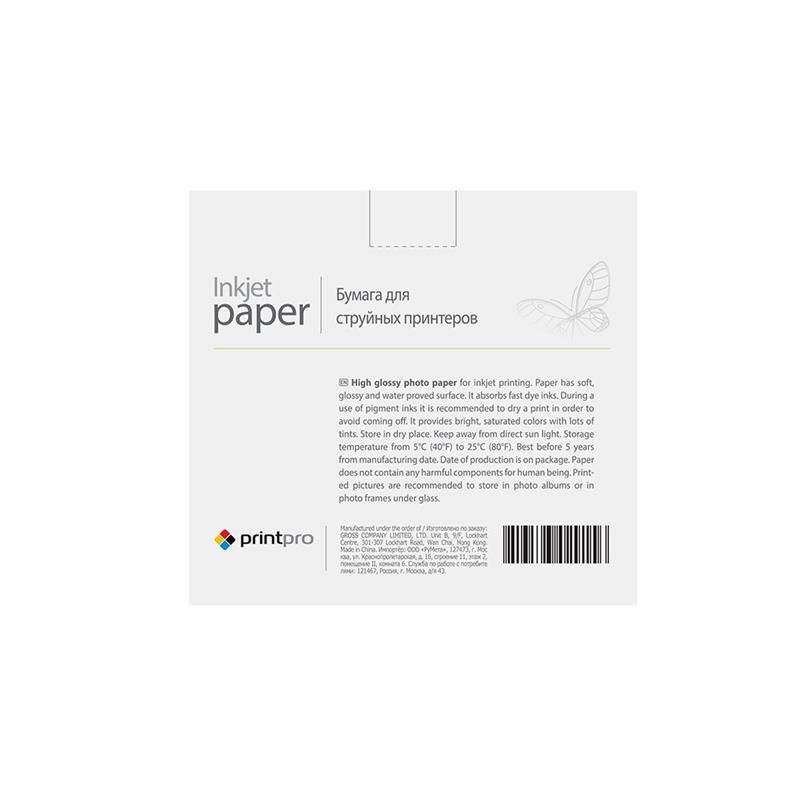 Глянцевий фотопапір PrintPro для повсякденного струменевого і лазерного друку. Має гладку, глянцеву поверхню. Завдяки паперовій основі і помірним ступенем глянцю, папір підходить для друку фотографій і графіки, як на струменевих, так і лазерних принтерах. Має гарні властивості по вбиранню чорнил та закріпленню тонера. При друку пігментним чорнилом рекомендовано просушувати відбиток щоб запобігти змазуванню з поверхні. Зберігати в сухому місці в стороні від сонячного світла. Температура зберігання від 5°С до 25°С. Не містить шкідливих для здоров"я речовин. Надруковані знімки рекомендовано зберігати в альбомах або в рамках під склом. Ця модель паперу призначена тільки для друку на струменевому принтері та персонального використання.