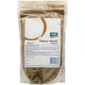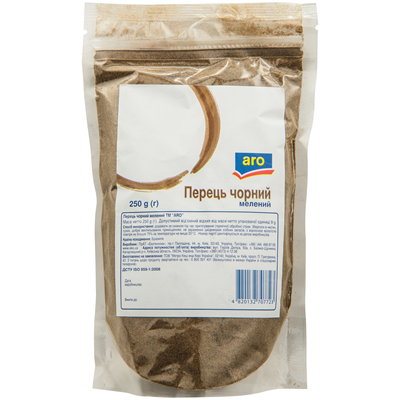 Aro Перець чорний мелений 250г. Склад: перець чорний мелений. Країна походження: Бразилія. Зберігати в сухих, чистих приміщеннях з працездатною вентиляцією, не заражених шкідниками, за температури не вище 20°C та відносній вологості повітря не більше 75%. Строк придатності 24 місяці.