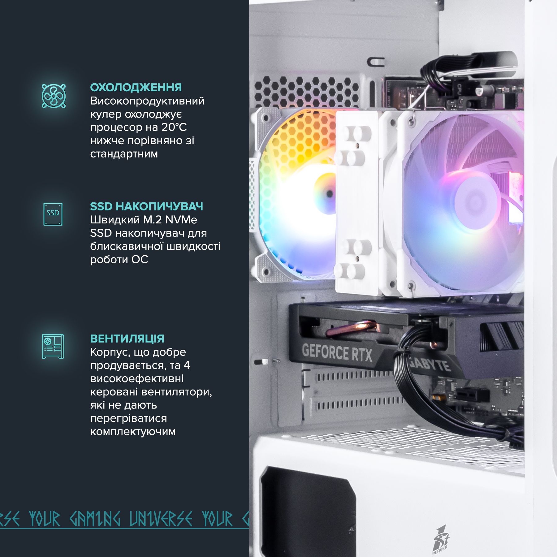 Геймер створює свій персоналізований, ігровий простір, де кожна деталь має особливе значення. Друк ваших улюблених героїв на корпусі, комплектуючі кращих виробників світу, безліч варіантів підсвітки - все це створить неймовірну атмосферу і ще більше занурить вас у світ гри.