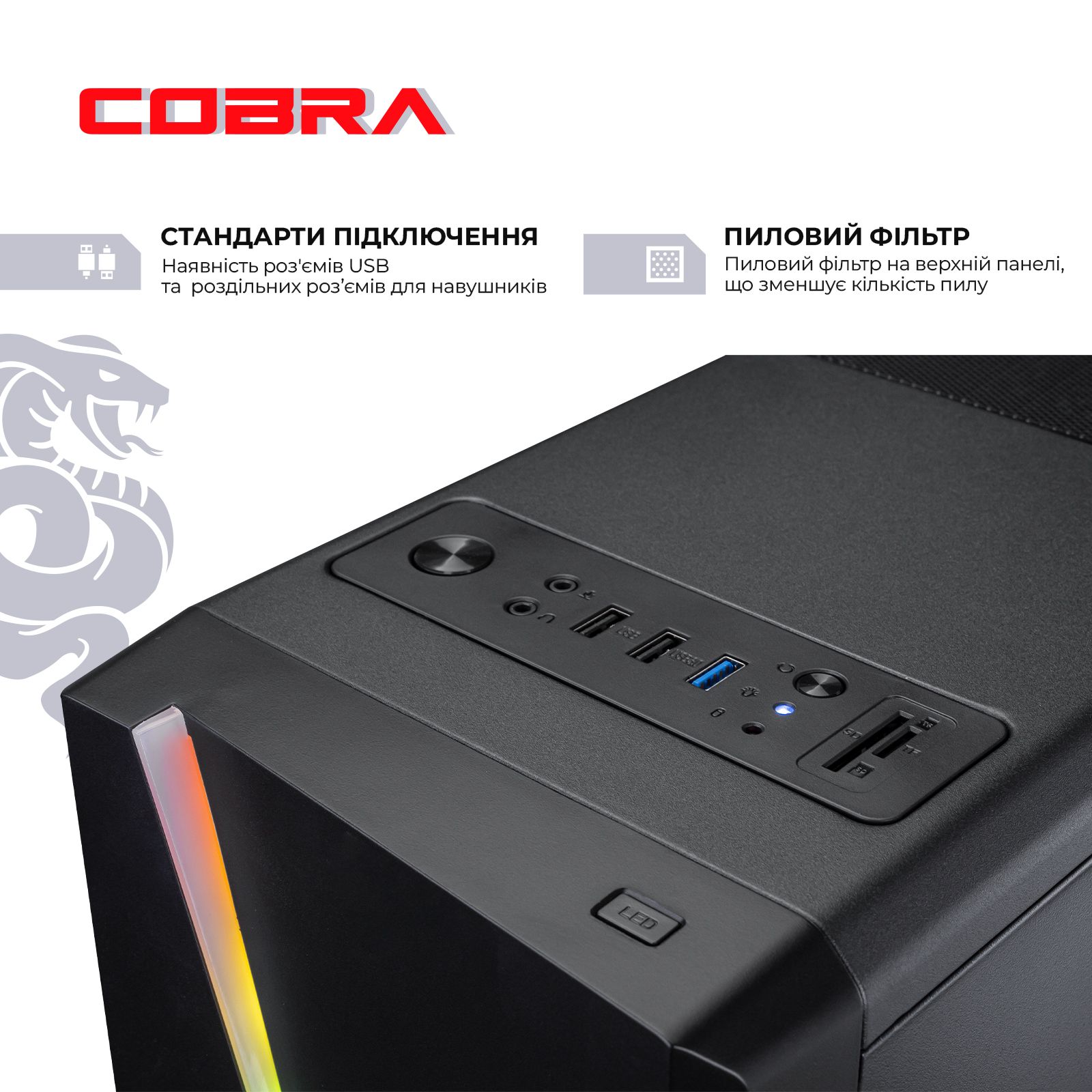 Професійна збірка комп"ютера COBRA забезпечить оптимальний повітряний потік всередині корпусу, а значить і відмінне охолодження всіх компонентів ПК.