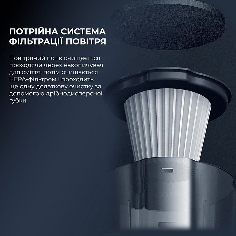 Пилосос Deerma DX115C обладнаний потрійною системою очищення повітря, основу якої становить HEPA-фільтр. Пилозбірник ємністю 1,2 літра додатково оснащений циклонним фільтром і спеціальним фільтруючим спонжем.