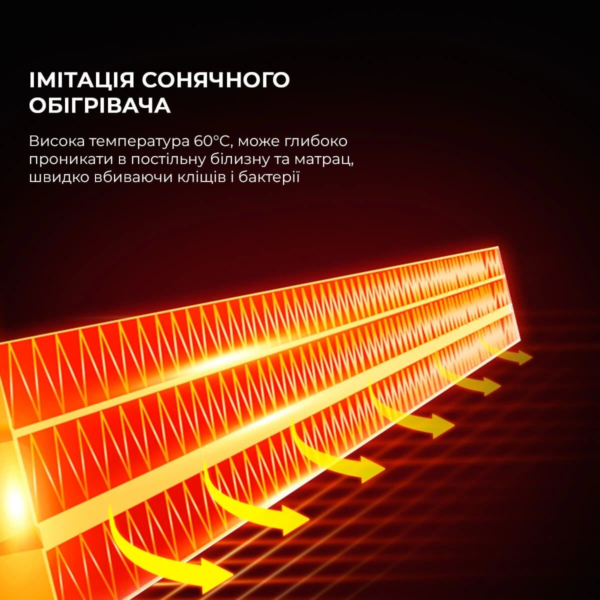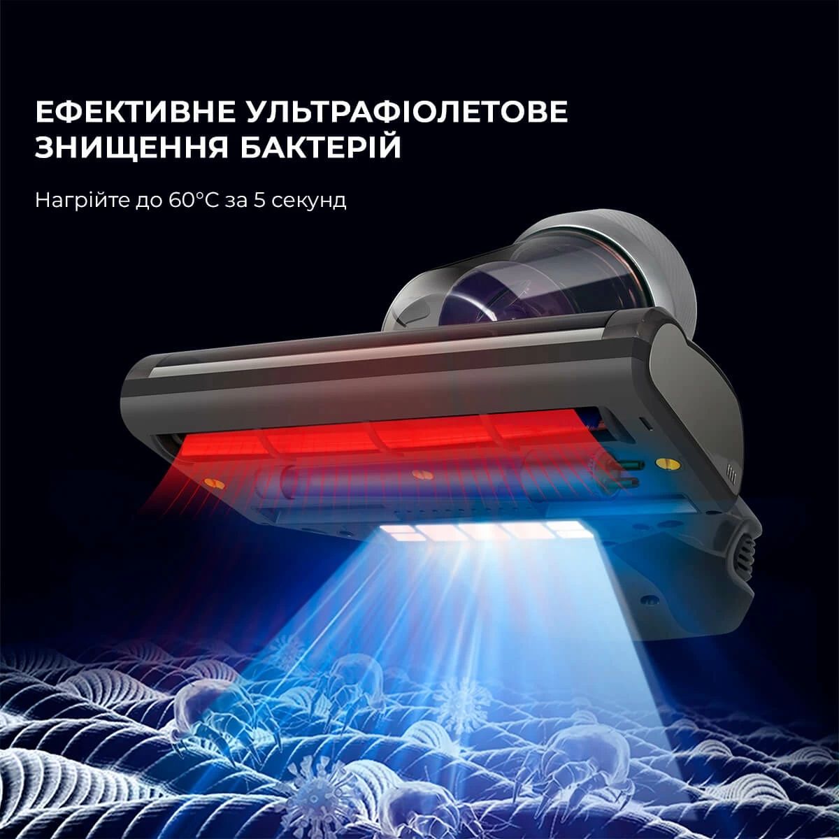 Конструкція пилососу має вбудовану лампу, яка випромінює ультрафіолетове світло. Пилосос з ультрафіолетовими хвилями ретельно очищає та вбиває всі бактерії, віруси та мікроорганізми на поверхні тканини та всмоктує їх у контейнер накопичувач пилу та сміття. Ультрафіолетовий діапазон освітлення проникає всередину тканин безпосередньо під час роботи пилососу для більш ефективного чищення.