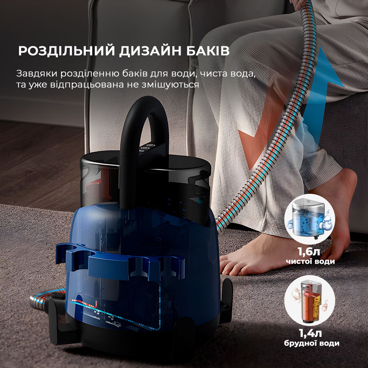 Миючий пилосос має систему очищення, яка забезпечує очищення за допомогою води глибоких шарів тканини та швидке сушіння килимів, диванів або штор. Не потрібно розбирання меблів розбирання та прання чохлів/штор. Чистота будинку – просто та зручно!